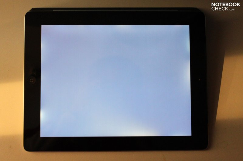 Betrachtet man ein dunkles Bild oder einen rein schwarzen Hintergrund in abgedunkelter Umgebung, so konnten wir bei unserem Testgerät das so genannte „bleeding“ beobachten. Dabei scheint die Displaybeleuchtung an gewissen stellen im Randbereich durch und sorgt für hellere Stellen am Display. Über dieses Problem berichten auch zahlreiche andere Magazine womit man davon ausgehen kann, dass sehr viele bzw. möglicherweise alle aktuellen iPads davon betroffen sind. Im Normalbetrieb fällt diese Ausleuchtungsschwäche nicht wirklich auf. Sofern man aber ein Video mit beonders dunklen Bildern in abgedunkelter Umgebung ansieht, können die Lichtflecken schon sichtbar werden.