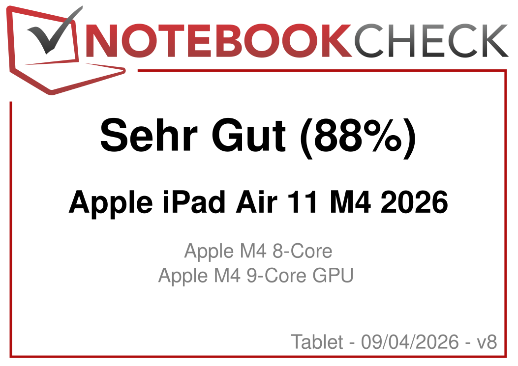 | Apple iPad Air 11 M4 2026 Apple M4 8-Core ⎘ Apple M4 9-Core GPU ⎘ 12 GB RAM, 128 GB NVMe | Amazon: 597,00 € Bestpreis 599€ Coolblue 2. 599€ galaxus 3. 599.02€ büroshop24 | 464 g | 128 GB NVMe | 10.86" 2360x1640 265 PPI IPS | |