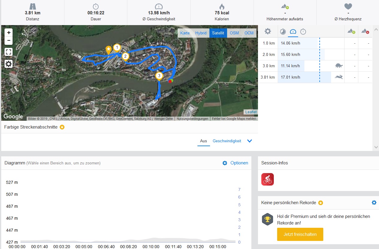 Die WiFi-Version des iPad Mini 5 kann sich lediglich auf den e-Kompass und die iBeacon-Mikro-Ortung stützen, um den eigenen Standort zu bestimmen. Für eine alltagstaugliche Navigation sind beide Elemente nicht ausreichend, was auch gut an der Wegaufzeichnung unserer obligatorischen Fahrradtour zu sehen ist. Mit unserem Referenzgerät Garmin Edge 520 kann das Apple-Tablet nicht mithalten. Käufer der Cellular-Version mit LTE erhalten allerdings die Möglichkeit, A-GPS und GLONASS mit ihrem iPad zu nutzen.