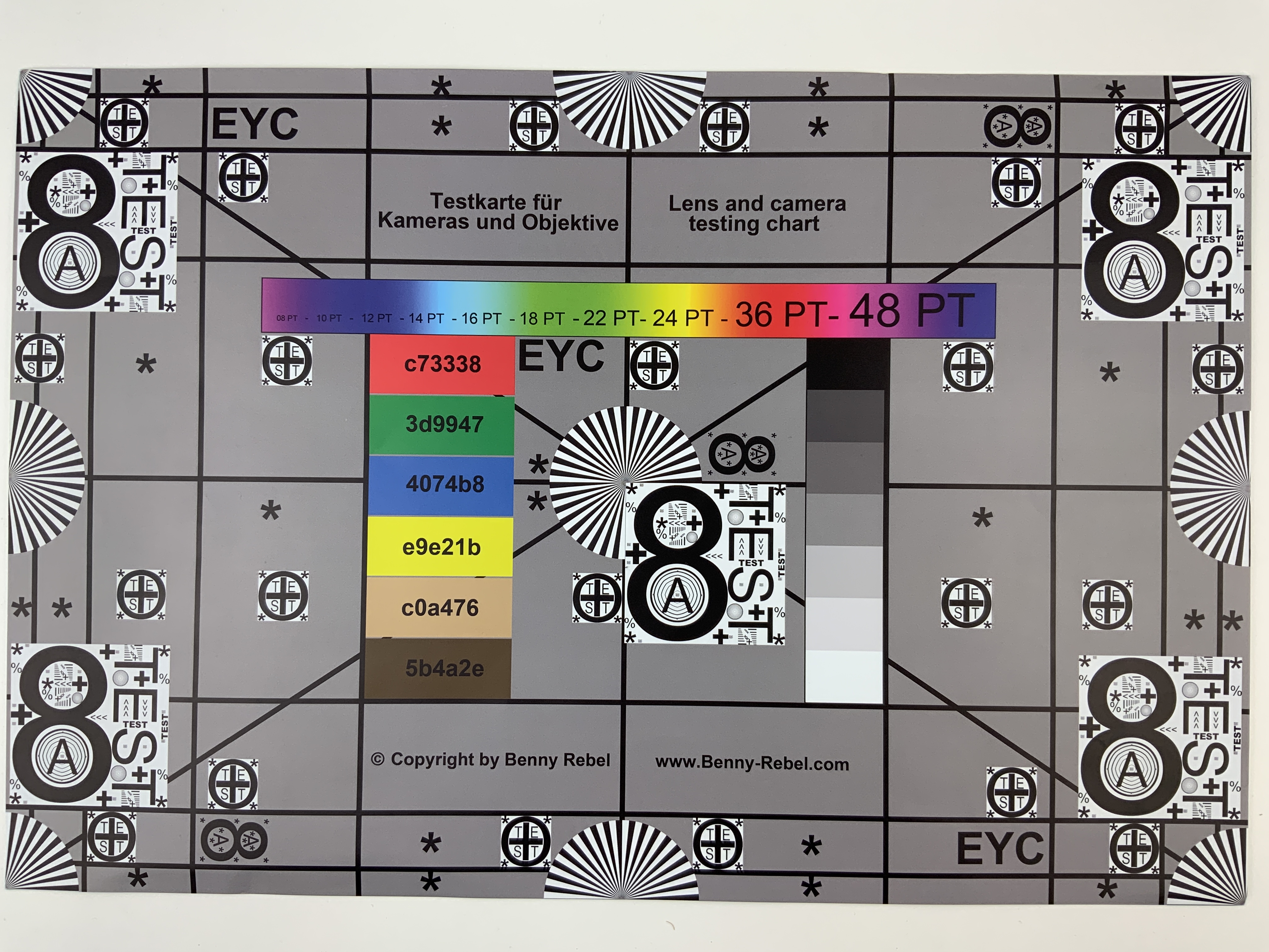 Szene 1Szene 2Szene 3Szene 4Unter Laborbedingungen macht die Hauptkamera kontraststarke und weitestgehend farbechte Aufnahmen, sofern gute Lichtverhältnisse anliegen. Hier hat das iPad Pro auch kein Problem, den Testchart scharf abzubilden. Wie der obere Testchart zeigt, bringt schwaches Licht die Optik dagegen an ihre Grenzen. Die Farbabweichungen sind hier so hoch, dass sich Bilddetails kaum noch voneinander unterscheiden lassen.