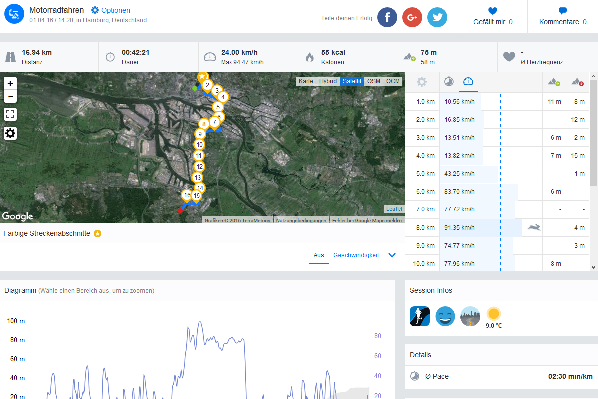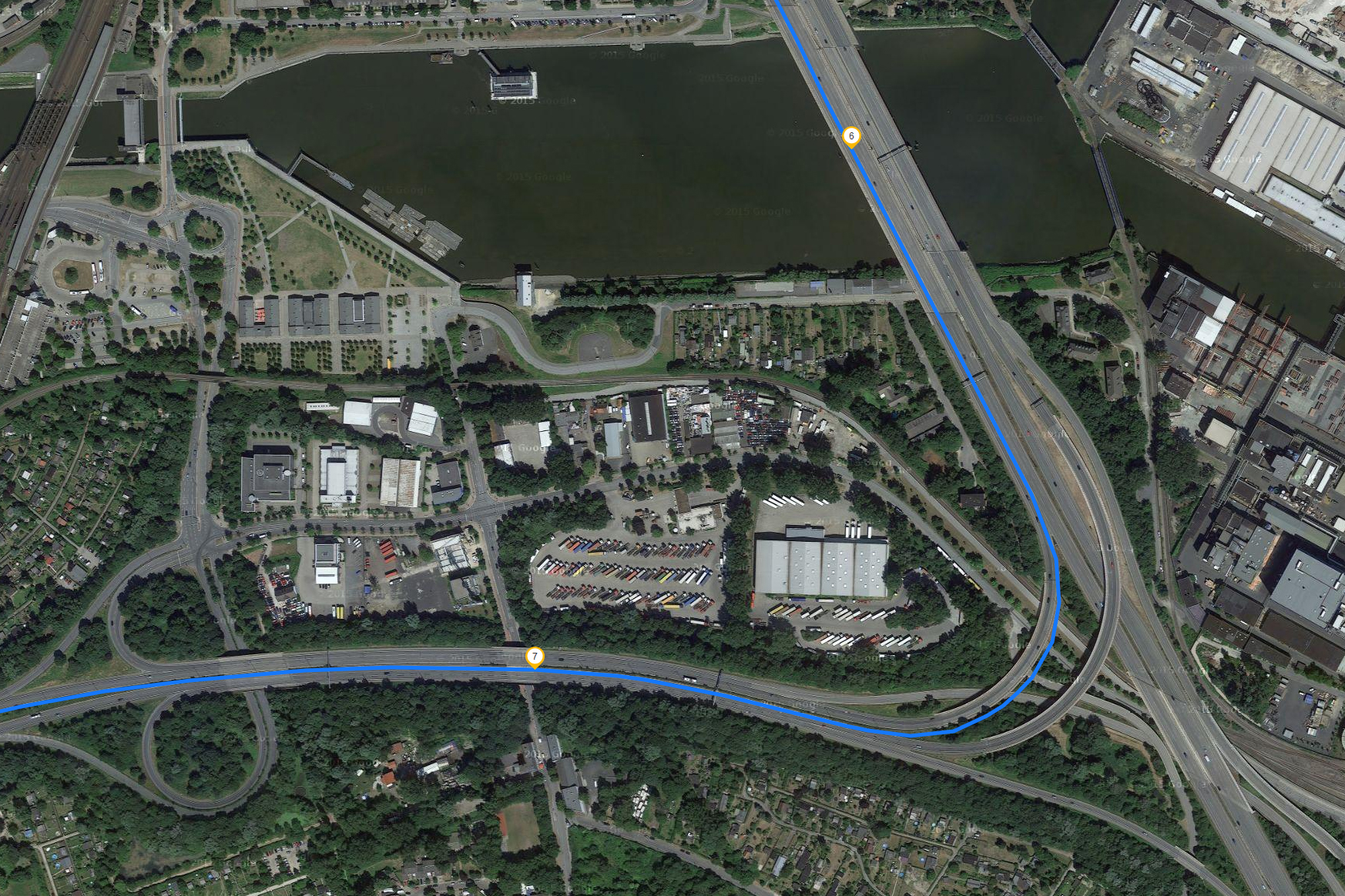 Zur Positionsbestimmung werden die Satelliten-Netzwerke GPS und Glonass genutzt. Selbst in Gebäuden gelingt eine zügige Ortung. Um die Genauigkeit besser beurteilen zu können, haben wir das iPad Pro 9.7 auf eine kleine Autofahrt mitgenommen, wo es sich dem Vergleich mit dem Fahrrad-Computer Garmin Edge 500 stellen muss. Dabei zeigt sich, dass das Tablet seinen Standort recht häufig abruft und in summa auf einem ähnlichen Niveau liegt wie das Gerät von Garmin. Letzteres war auf den Straßen der Großstadt exakter, dafür ist das iPad auf der Autobahn genauer. Für die Navigation ist das Tablet daher bestens geeignet.