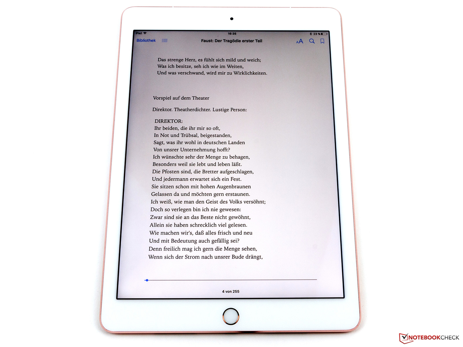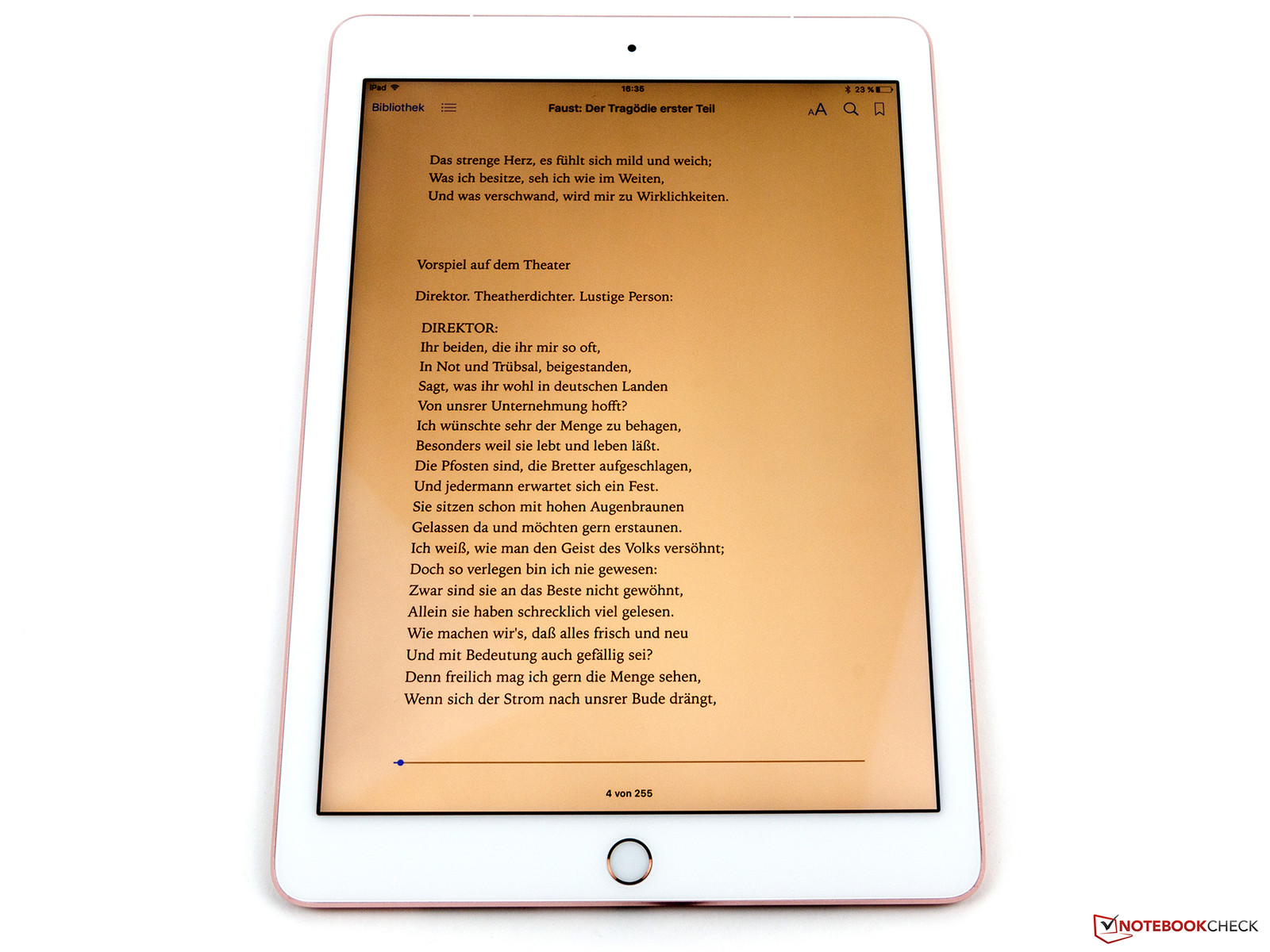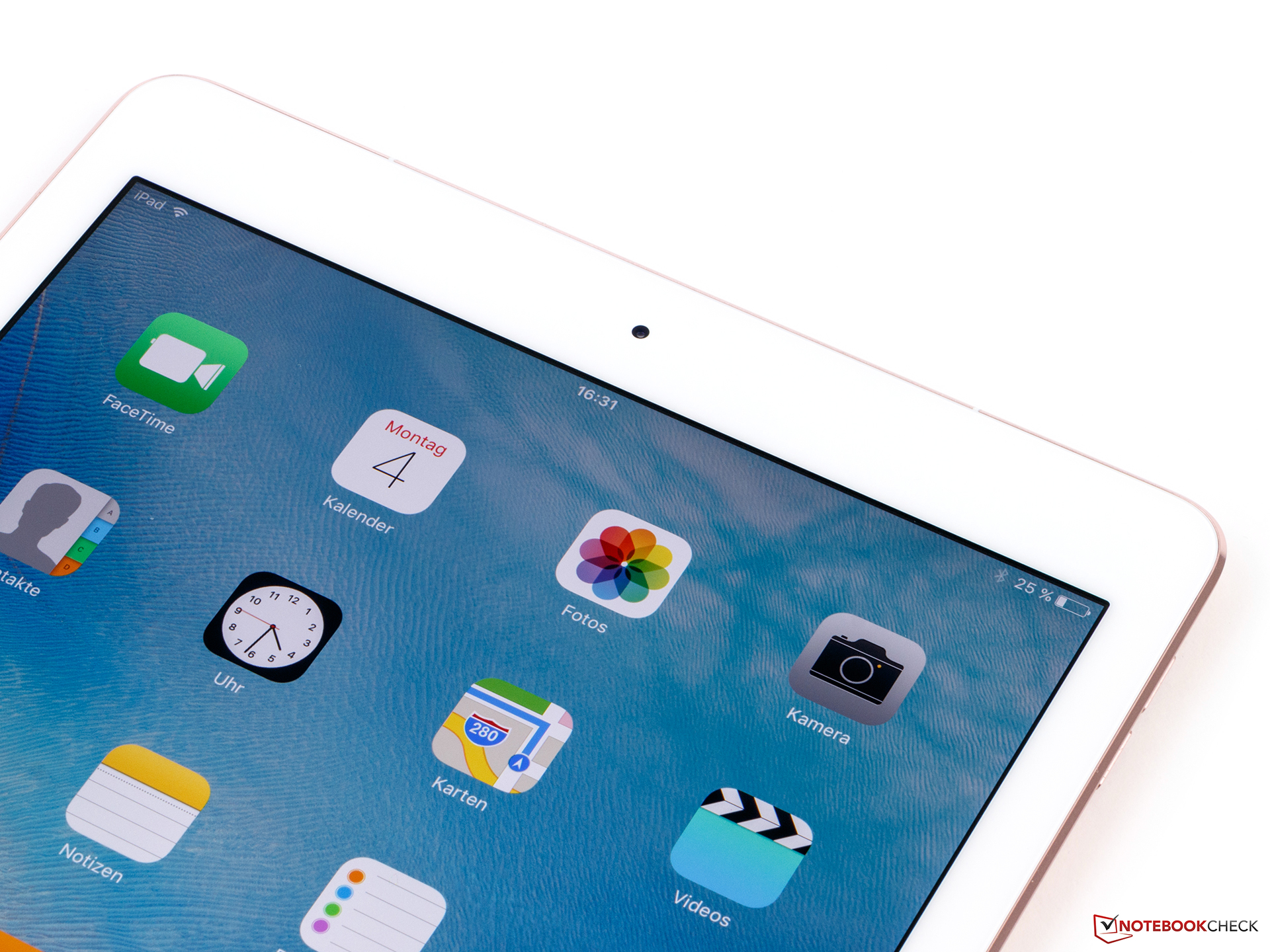 Wie beim iPad Air 2 und dessen Vorgängern setzt Apple auch bei der kleinen Pro-Variante auf ein 9,7 Zoll großes IPS-Panel. Dieses bietet eine Auflösung von 2.048 x 1.536 Bildpunkten, was einer Pixeldichte von 264 PPI entspricht. Inhalte werden damit ausreichend scharf dargestellt, bei genauer Betrachtung sind jedoch Treppcheneffekte erkennbar.