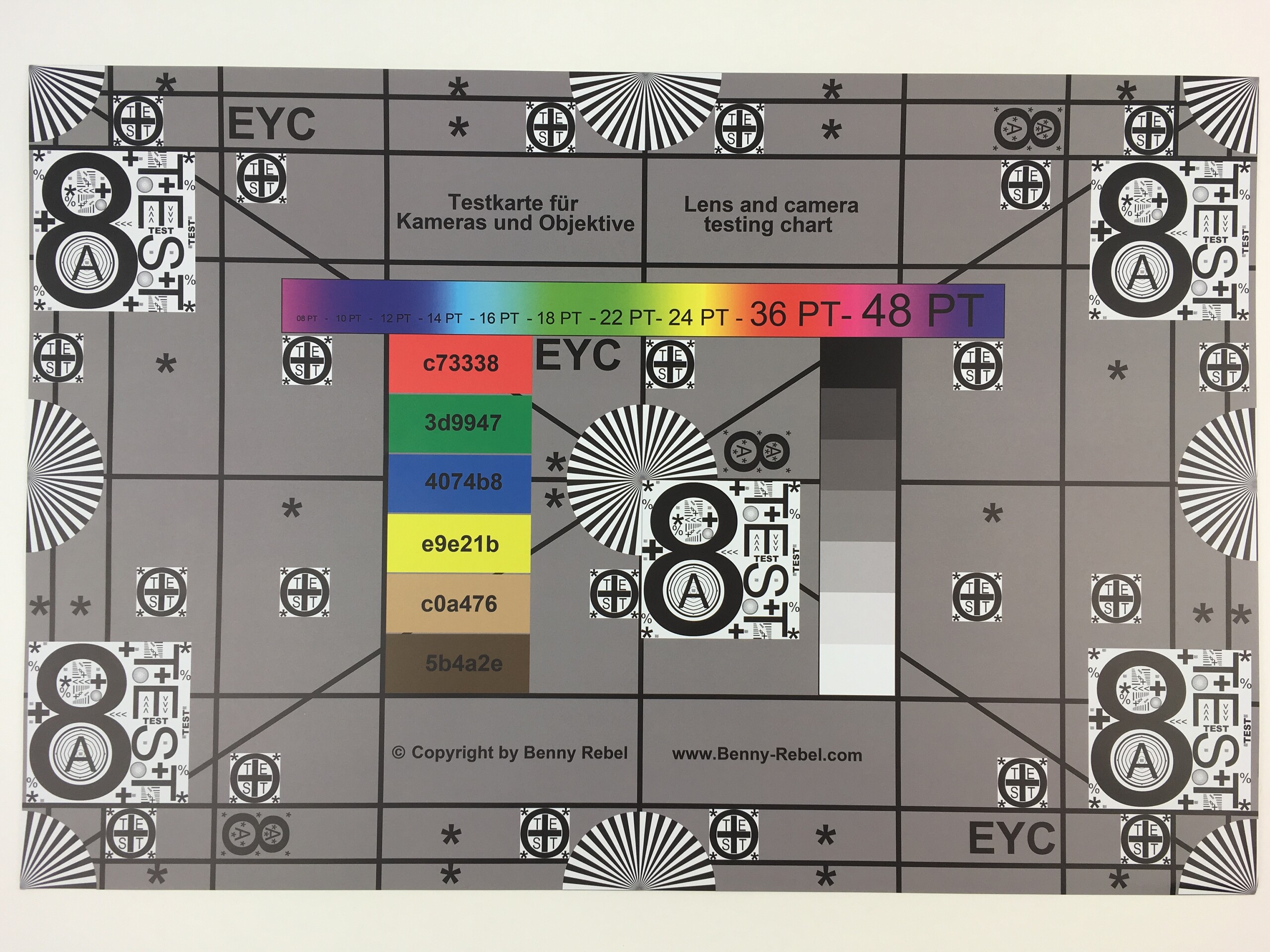 Ebenfalls unter kontrollierten Lichtbedingungen habe wir unser Testchart abfotografiert, ohne anschließend irgendwelche Nachbearbeitungen vorzunehmen. Die Schärfe in der Bildmitte liegt dabei auf einem guten Niveau und bleibt auch zu den Aufnahmerändern vergleichsweise stabil, lediglich die Kontraststärke nimmt leicht ab. Im direkten Vergleich zum iPhone SE können wir keinen Unterschied feststellen. Das iPhone 6s Plus hingegen zeigt eine noch bessere Abbildungsleistung. Vor allem bei den Schriftzeichen auf den dunklen Farbfeldern ist dies gut zu erkennen. Die Zeichen besitzen bei Apples Premium-Smartphone eine höhere Schärfe und fransen sichtbar weniger aus. Generell wirkt die Aufnahme mit dem 6s Plus kontraststärker als mit den beiden anderen Geräten, trotz identischer Aufnahmeeinstellungen (f/2.2, 1/100 sec, ISO 25, iOS 9.3.1). Der Eindruck aus den Umgebungsaufnahmen bestätigt sich also. Woran dies jedoch genau liegt, können wir abschließend nicht beurteilen. Gut möglich, dass Apple dies mit einem Software-Update beheben kann. Da die Unterschiede nur bei voller Vergrößerung sichtbar werden, wird dies für die meisten Nutzer keine Rolle spielen.