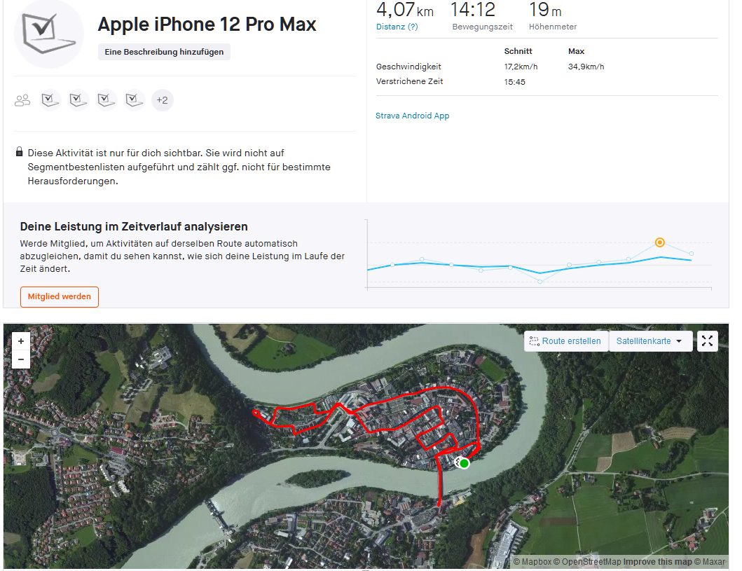 Das Smartphone muss sich natürlich in unserem Ortungstest beweisen, bei dem wir zum Vergleich das Garmin Edge 520 einpacken und uns auf unser Fahrrad schwingen. Tatsächlich zeigt das iPhone 12 Pro Max eine genaue Positionsbestimmung auch in schwierigen Situationen. Minimale Aussetzer lassen sich feststellen, und bei der Brückenquerung wird nicht immer die richtige Straßenseite angezeigt. Dennoch ist die Genauigkeit insgesamt so gut, dass man das iPhone 12 Pro Max auch dann empfehlen kann, wenn exakte Ortungsdaten benötigt werden.