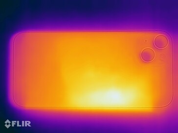 Unter Last erwärmen sich die Oberflächentemperaturen des Apple iPhone 15 Plus zwar spürbar, jedoch bleiben diese unterhalb von 40 °C.