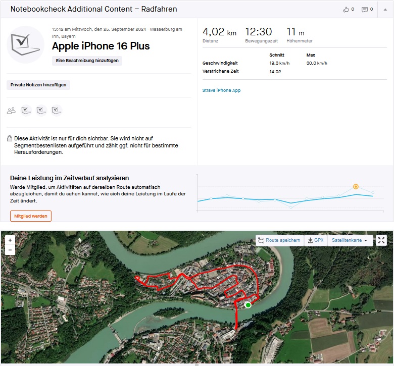 Das Apple-Smartphone zeigt sich in unserem Praxistest ebenfalls recht genau bei der Ortung. Selbst gefahrene Ausweichmanöver werden korrekt erfasst. Allerdings gibt es kleinere Positionierungsprobleme in den engen Altstadtgassen, hier stimmt die gefahrene Strecke nicht immer völlig.