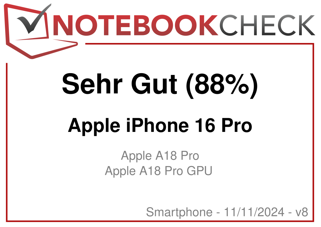 | 87.9 % | v8 | 10 / 2024 | Apple iPhone 16 Pro A18 Pro, A18 Pro GPU | 199 g | 128 GB NVMe | 6.30" | 2622x1206 | |