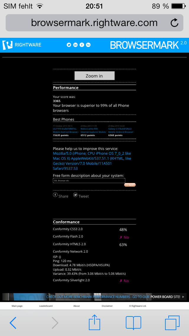 Im 3DMark Benchmark ergeben sich im Ice Storm keine zählbaren Werte (Maxed out!). Im Ice Storm Extreme ergibt sich ein Top-Ergebnis, da aber Teilwertungen auch nicht zählbar gewertet wurden, gilt auch dieser als "Maxed out!". Der Unlimited Test zeigt eine sehr gute Performance, die nicht weit hinter dem Sony Xperia Z1 liegt. Beim Graphics Score kommt das iPhone 5s sogar auf Augenhöhe heran.