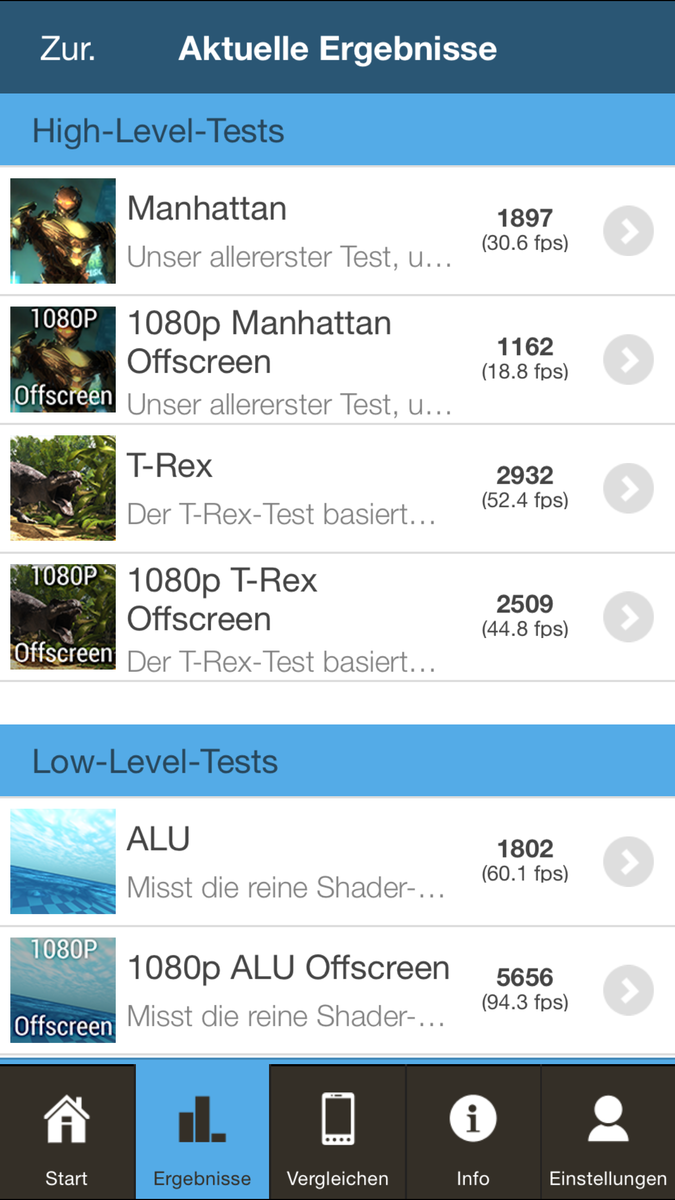 Ein interessanter Faktor ist immer, ob der Prozessor und die Grafikeinheit bei andauernder Belastung eine stabile Leistung bieten. Mit Hilfe des Akku-Tests des GFXBench 3.0 kann dies genau überprüft werden. Dabei wird dreißigmal der T-Rex-Onscreen-Test durchgeführt, um ein Ergebnis zu ermitteln. Das Tool zeichnet nicht nur den Energieverbrauch auf, sondern auch die Frameraten. Das iPhone 6 Plus kann überzeugen und liefert über den gesamten Testdurchgang eine konstante Performance.