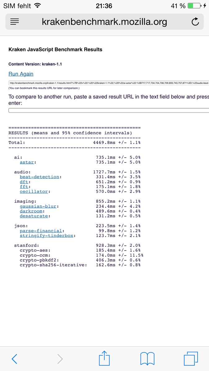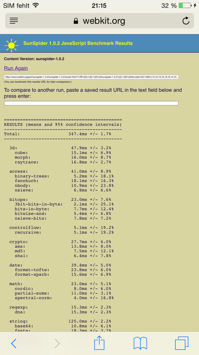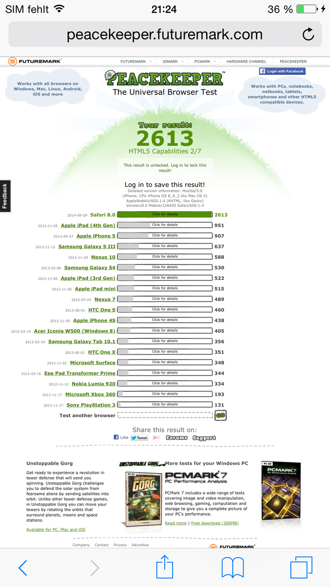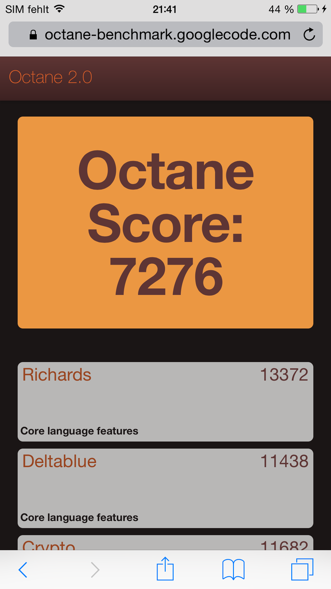 In puncto Browserperformance macht Apple keinem was vor und so ist das iPhone 6 Plus in diesem Bereich hervorragend. Das Surfen im Web geht flott von der Hand und auch die Benchmarks bestätigen die gefühlt hohe Geschwindigkeit. Das Testgerät dominiert die Konkurrenz und macht sogar noch etwas Boden zum iPhone 6 gut. Dies könnte jedoch auf die neuere iOS-Version zurückzuführen sein. Lediglich der Browsermark 2.1 bereitete Probleme. Der Benchmark wollte einfach nicht durchlaufen, sondern stürzte laufend ab, nur um selbständig wieder von vorne zu beginnen. Hier konnten wir kein Ergebnis ermitteln.