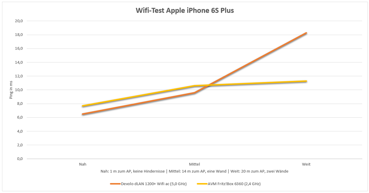 Leider lässt sich bei den iPhones nicht die Dämpfung der WLAN-Funksignale auslesen, sodass wir uns stattdessen die Pingzeiten des iPhone 6S Plus genauer angeschaut haben. Dabei haben wir diese über mehrere Minuten protokolliert und dann einen Durchschnittwert errechnet. Im 5-GHz-Netz können wir in der nahen und mittleren Distanz recht konstante Pingzeiten messen, welche stets unter 12 Millisekunden (ms) bleiben. Bei einer weiten Entfernung zum Access Point (AP) bewegen sich diese auf einem ähnlichen Niveau, zeigen jedoch gelegentlich kleine Ausreißer bis zu 27 ms. Da aber selbst dann noch eine gute Signalqualität bescheinigt wird, gibt es dadurch keine ernsthaften Einschränkungen. Ein HD-Videostream (720p) lief auch dann problemlos. Im 2,4-GHz-Netz sind die Schwankungen ein wenig größer, und die Signalqualität fällt bereits bei einer mittleren Entfernung zum Router leicht ab. Aber auch hier waren keine nennenswerten Einschränkungen spürbar. Lediglich der Webseitenaufbau verzögert sich minimal. In summa zeigt das iPhone 6S Plus eine prima Wifi-Performance.