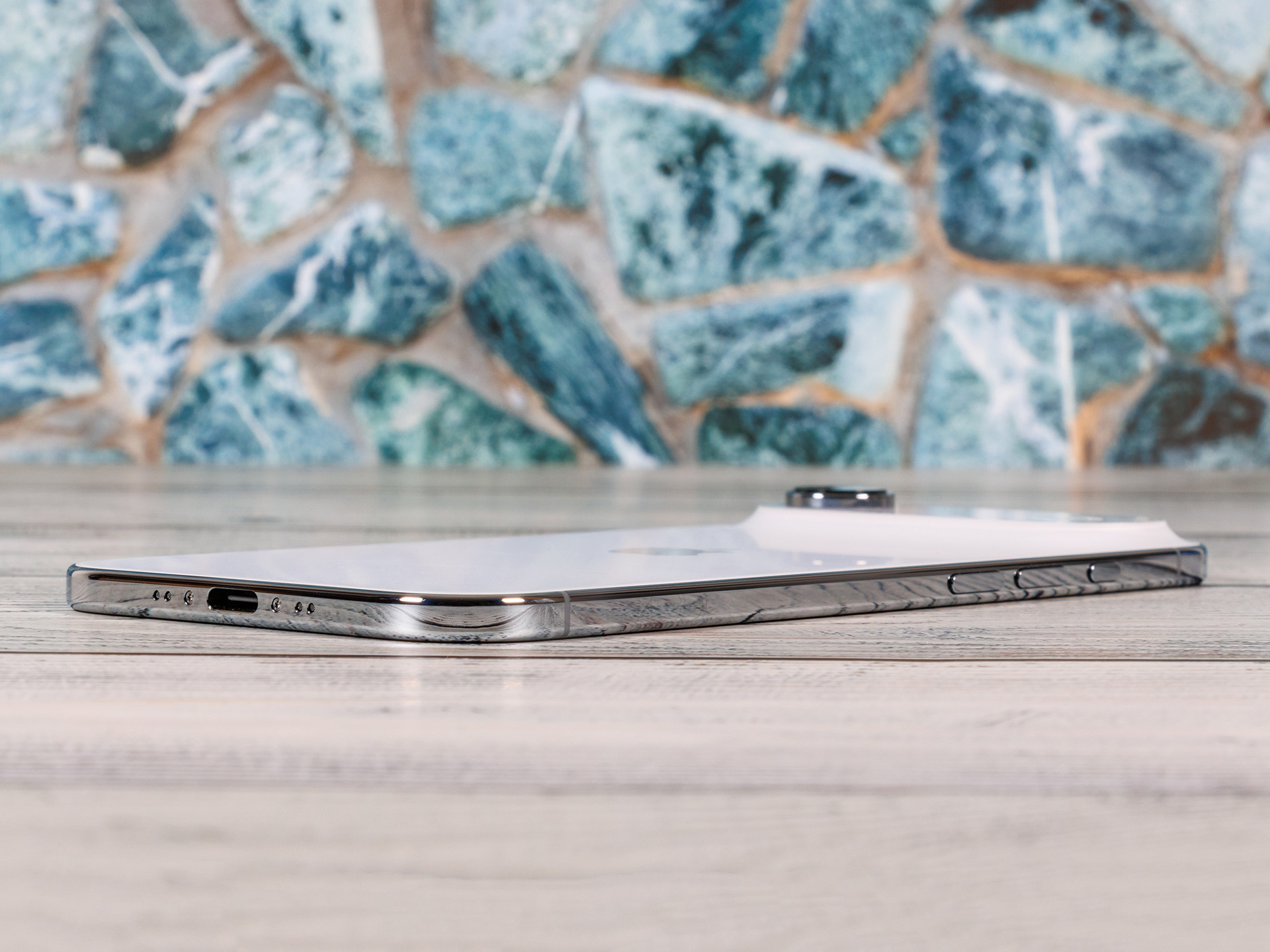 Beim Rahmen setzt Apple auf eine hochglanzpolierte Titanlegierung. Diese sieht zwar schick aus, ist aber entsprechend anfällig für Fingerabdrücke. Auf der Vorderseite kommt Ceramic-Shield-2-Schutzglas zum Einsatz, während es auf der Rückseite noch das ältere der 1. Generation ist. Trotz seiner schlanken Bauweise hinterlässt das Air einen sehr robusten Eindruck und trotzt Verwindungsversuchen, ohne einen Laut von sich zu geben. Die Verarbeitung ist sehr gut und überzeugt mit enganliegenden und gleichmäßigen Spaltmaßen, auch das Display-Oberflächen-Verhältnis fällt mit 89 % in die Kategorie ansprechend.