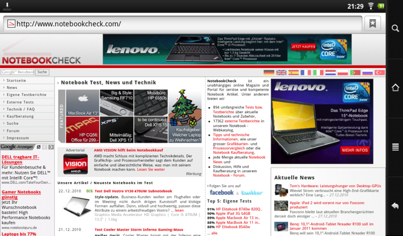 Kein Glück hatten wir mit Adobes Flash Player 10. Obwohl für Android 2.2 von Archos angekündigt, wurde dies bei unserem Upgrade nicht installiert. Da auch der Zugang zum Android Market wie bereits beschrieben verwehrt ist, konnten wir Flash auch nicht nachträglich installieren.