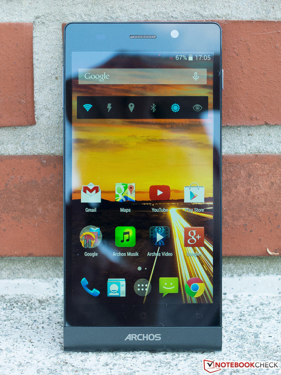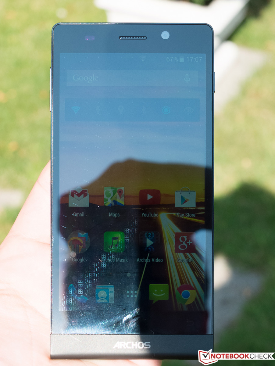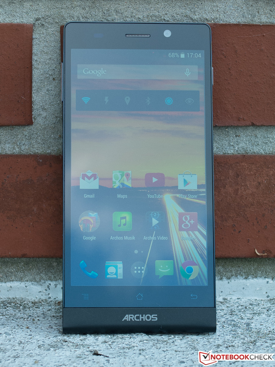 Im praxisnahen WLAN-Test mit abgeschalteten Verbrauchern wie Mobilfunk und Bluetooth sowie auf etwa 150 cd/m² reduzierter Helligkeit schafft das Archos passable 10 Stunden und liegt damit leicht über dem Durchschnitt gleich großer, aktueller Smartphones.
