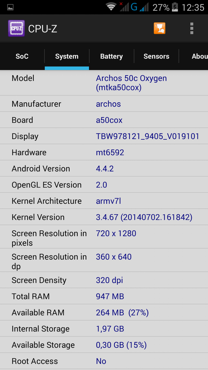 Beim MediaTek MT6592 handelt es sich um ein SoC mit 8 Rechenkernen, die allerdings auf der weniger leistungsfähigen, dafür aber sparsamen ARM-A7-Architektur basieren und im Archos 50c Oxygen mit Taktfrequenzen von rund 0,7 bis 1,7 GHz arbeiten. Die integrierte GPU namens Mali-450 MP4 erreicht maximal 700 MHz und unterstützt in Sachen Videodecodierung Ultra HD, H.264 sowie H.265 in Hardware. Das Funkmodul mit Dualband-WLAN n, Bluetooth 4.0 sowie Miracast ist ebenfalls Bestandteil des SoC. Darüber hinaus sind noch ein FM-Tuner sowie GPS integriert.