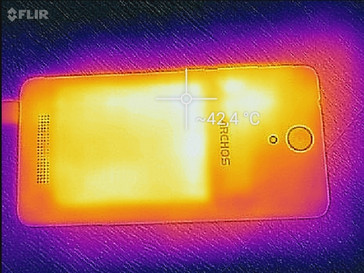 Selbst bei rechenintensiver Benutzung bleibt das 50e Neon in den Händen angenehm, und die Temperaturentwicklung im täglichen Einsatz ist kaum wahrnehmbar. Unter Auslastung des Systems (CPU und GPU) mittels der App „Stability-Test“ für mindestens 1 Stunde messen wir maximal 43,1 °C auf der Geräteoberseite.