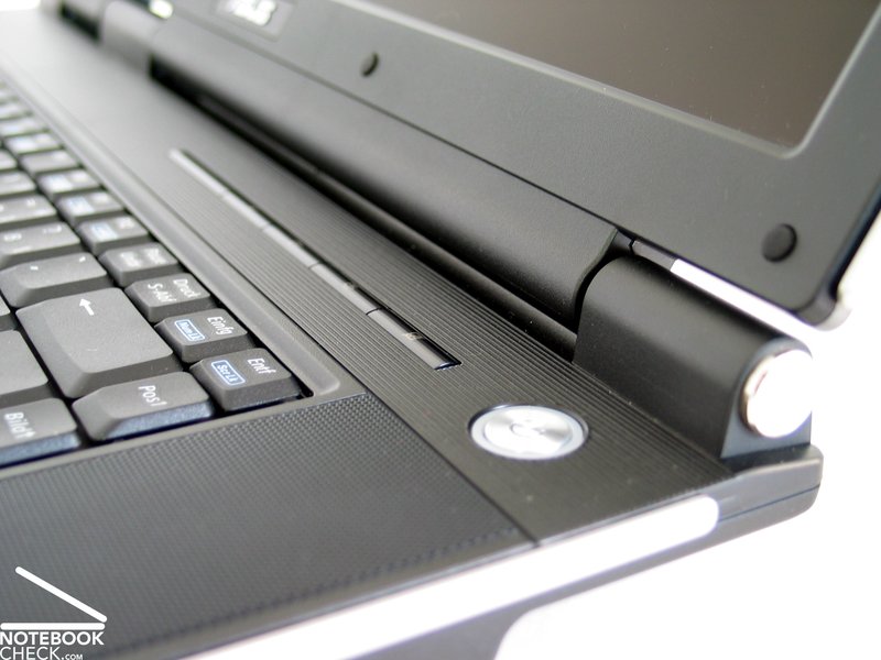 Das 17 Zoll Display wird von 3 überaus robust wirkenden Scharnieren gehalten, die ein leichtes aber vertretbares Wippen des Bildschirms ermöglichen. Wie auch mobilere Notebook Geräte verfügt das A7Jc über ein Doppelhacken Verschlusssystem. Das Display wird damit sicher im geschlossenen Zustand gehalten. Das Entriegeln des Verschlusses funktioniert zwar mit der mittig angeordneten Drucktaste ganz gut, beim Anheben des Displays muss man dann aber schon etwas Fingerspitzengefühl zeigen, da die Baseunit etwas unter dem Display hervorragt und das Display so etwas schlecht zu fassen ist.