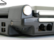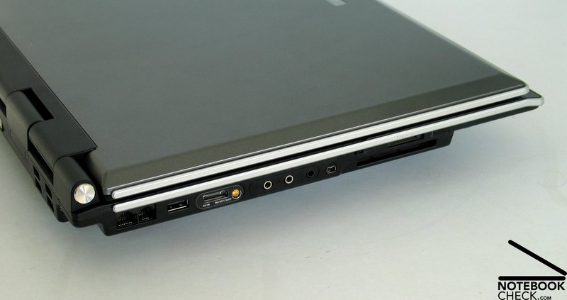 An der linken Seite findet man im hinteren Bereich einen Lan und einen Modem Anschluss, einen weiteren USB 2.0 Port, einen AV/S-Video Eingang (Adapter liegt bei), einen Antennenanschluss, die Audio Ports (Mic-In, Line-In, Headphones-Out / S/PDIF), ein Firewire Port, den CardReader, einen Expresscard Slot und einen IrDA Infrarot Port.