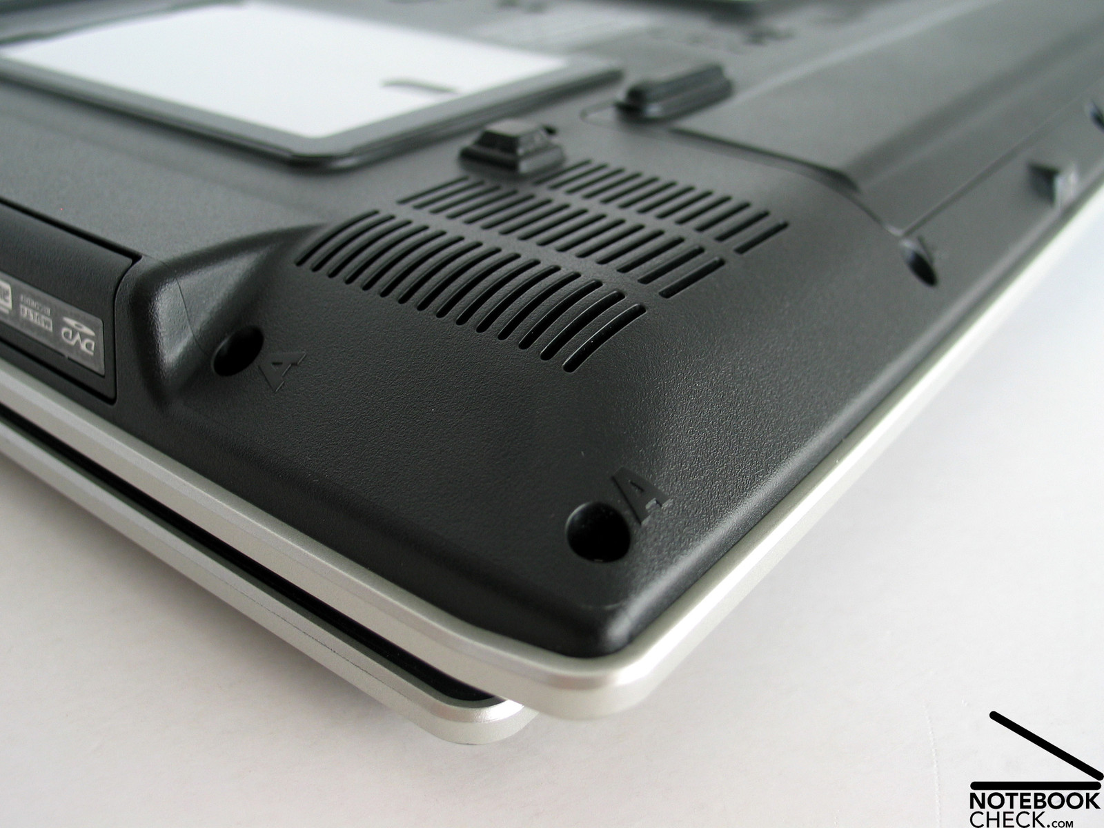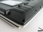 An der Rückseite findet man folgende Ports: 4x USB 2.0, DVI-D, VGA-Out, S-Video Out und ein Kensington Schloss. Im rechten Bereich ist die Ausstömöffnung des Lüfters platziert.
