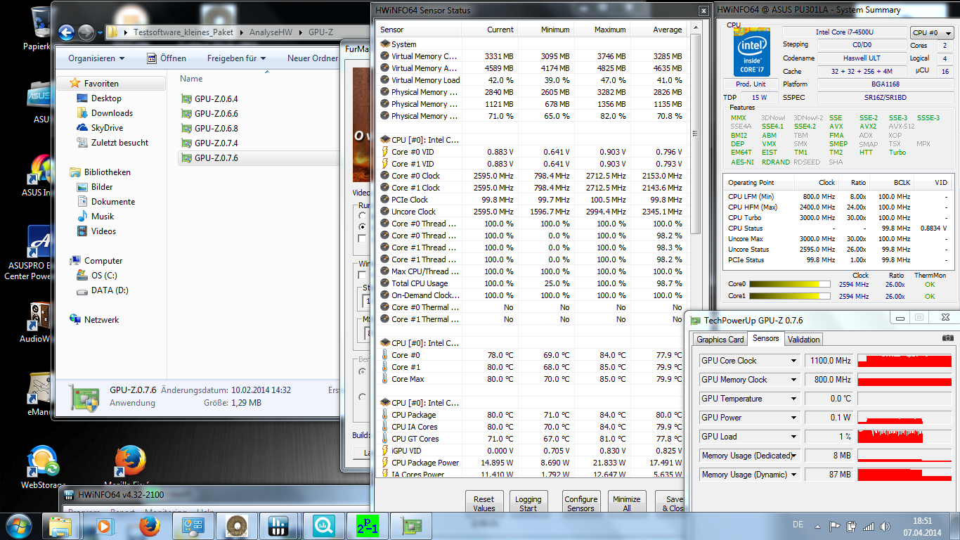 Den Stresstest fahren wir für eine Stunde, hier kommt es nun erstmals zum thermischen Throttling: Bei 82 ° fällt der Takt von 2,4 GHz schlagartig auf 1,5 GHz ab, um dann nach wenigen Sekunden (bei 81 °) wieder auf 2,4 GHz zu steigen. Die GPU taktet währenddessen konstant mit 1.100 MHz. Leistungseinbußen müssen Käufer nicht befürchten, obige CPU-Benchmarks und PCMarks zeigten ganz typische Scores für ein Core-i7-4500U-System.