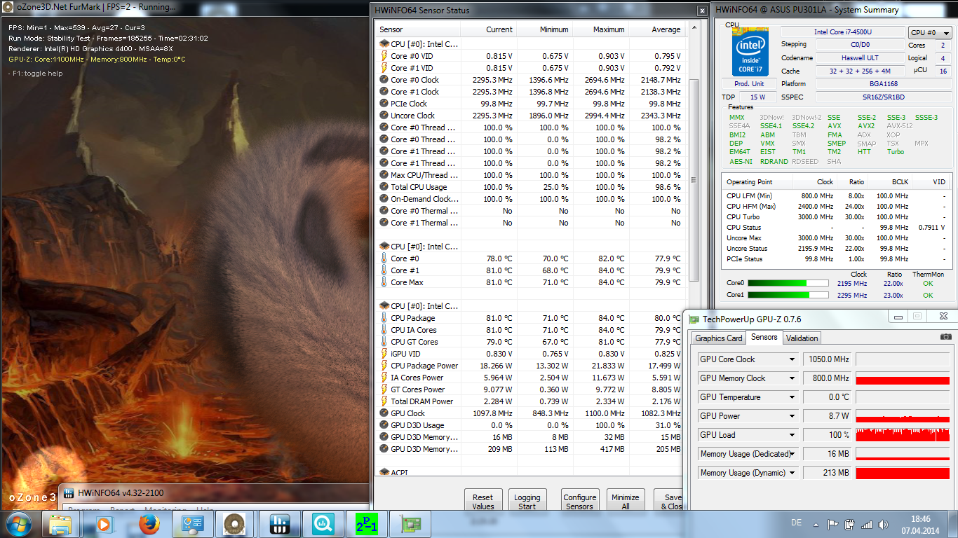 Wir prüfen die Leistungsreserven des Core i7 4500U in Bezug auf die Ausnutzung des Turbo. Hier gibt es nichts zu mäkeln, die Cinebench Tests als auch Prime95 absolviert das SoC mit 2,6 bis 2,7 GHz. Die Leistung sinkt im Akkubetrieb unmerklich, der Cinebench R11.5 Score fällt auf 2,64 Punkte. Volle Kraft auch bei der integrierten Grafik: Die HD 4400 rechnet konstant mit 1.100 GHz, das gilt auch für den Stresstest bei zeitgleicher CPU-Last.