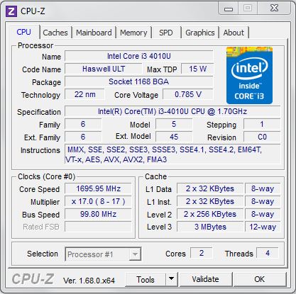 Im Testgerät ist ein Intel i3-4010U Prozessor der aktuellen Haswell-Generation von Intel verbaut. Das U in der Produktbezeichnung steht für die ULV-Serie von Intel. Diese werden wegen des geringeren Stromverbrauchs und der daraus resultierenden geringeren Abwärme und längeren Akkulaufzeit bevorzugt in Ultrabooks verbaut. Um dies zu erreichen, liegt die Taktfrequenz bei diesem Modell bei gerade einmal 1.700 MHz. Die TDP liegt bei 15 Watt. Da i3 bei Intel die gehobene Einsteigerklasse bezeichnet, beherrscht diese CPU zwar Hyperthreading und kann damit bis zu 4 Threads gleichzeitig bearbeiten, allerdings hat sie keinen Turbo Boost. Throtteling ist selbst nach stundenlanger intensiver Belastung im Test nicht zu verzeichnen. Ebenso wird im Akkubetrieb die Leistung nicht gedrosselt, die CPU kann mit voller Geschwindigkeit weiterarbeiten.