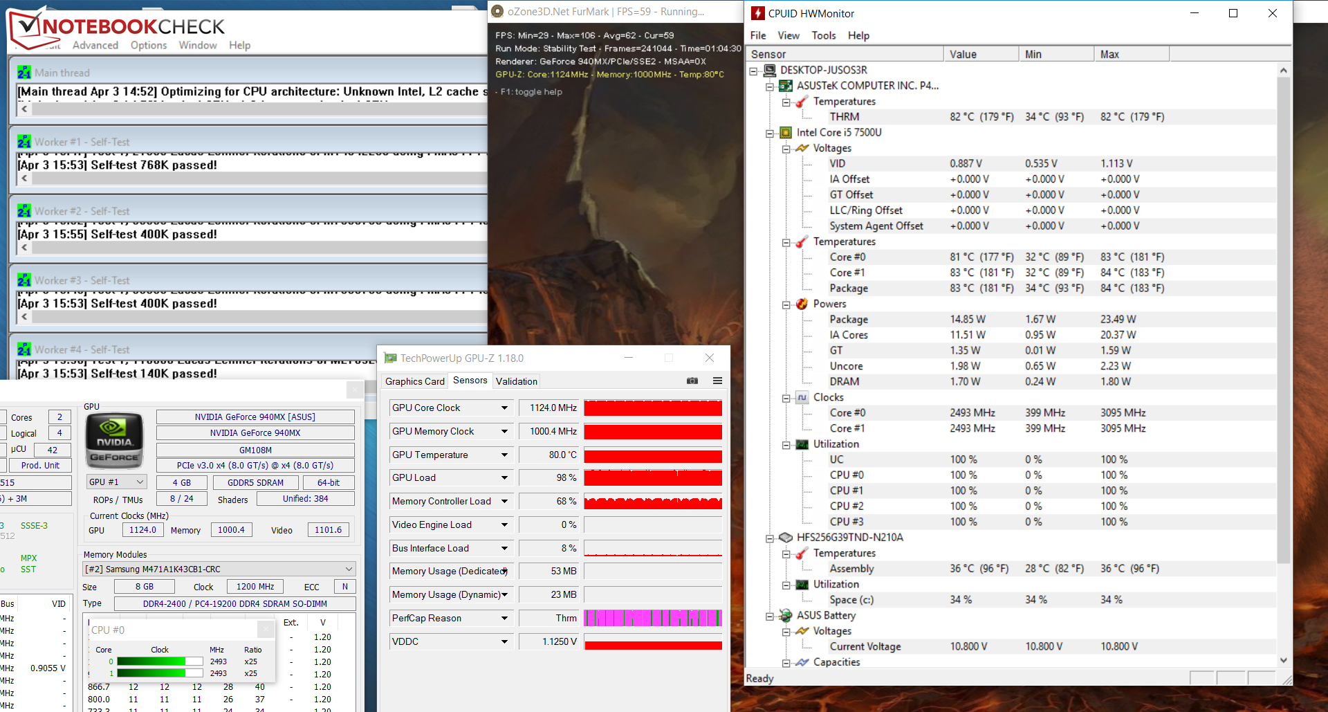 Unseren Stresstest (Prime95 und Furmark laufen für mindestens eine Stunde) durchläuft das Asus Notebook im Netz- und im Akkubetrieb auf unterschiedliche Weisen. Im Netzbetrieb beginnt der Prozessor den Stresstest mit einem Takt von 3,1 GHz. Schon nach einigen Sekunden wird der Wert auf 2,5 GHz gesenkt und verbleibt auf diesem Niveau. Der Grafikkern arbeitet mit Geschwindigkeiten jenseits von 1.100 MHz. Im Akkubetrieb springt der CPU-Takt zwischen 3,1 GHz und 400 MHz hin und her. Die GPU werkelt mit voller Kraft (1.163 MHz). Sonderlich stark erwärmt sich der Rechner nicht. Während des Stresstests liegen die Temperaturen an allen Messpunkten unterhalb von vierzig Grad Celsius.