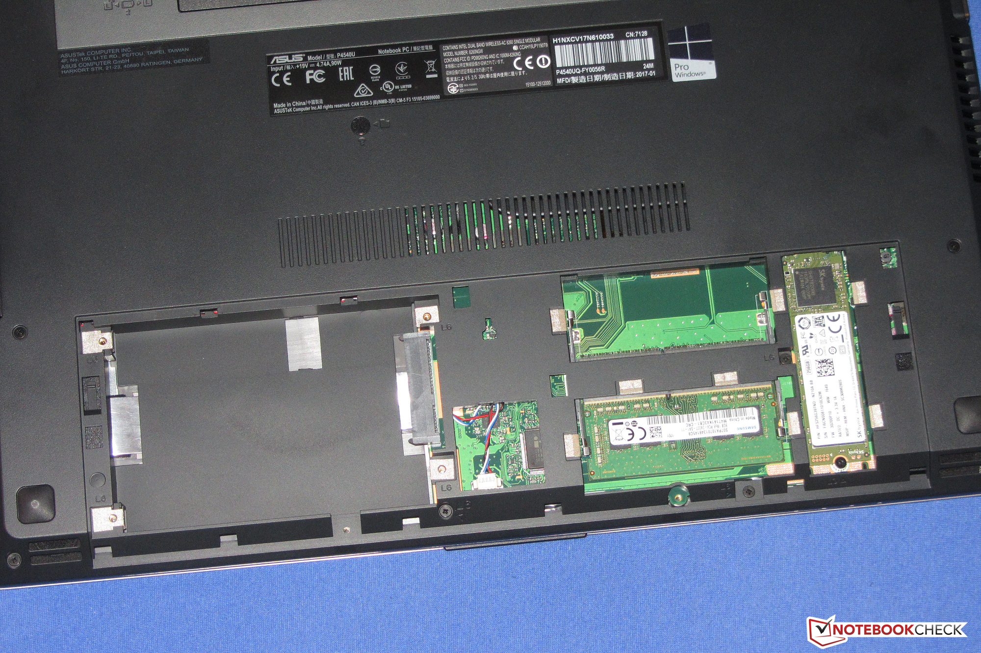 Als Systemlaufwerk dient eine Solid State Disk der Firma Hynix. Es handelt sich um ein M.2-Modell, das eine Gesamtkapazität von 256 GB bereitstellt. Davon sind im Auslieferungszustand etwa 190 GB nutzbar. Der restliche Speicherplatz wird von der Recovery Partition und der Windows Installation in Beschlag genommen. Die Transferraten der SSD fallen gut aus. Das P4540UQ bringt noch einen SATA-Steckplatz mit, der für eine 2,5-Zoll-Festplatte vorgesehen ist. Somit wäre eine Dualbestückung mit HDD und SSD möglich. Allerdings fehlt unserem Testgerät der Einbaurahmen für ein 2,5-Zoll-Laufwerk. Dieser müsste separat bei Asus besorgt werden.