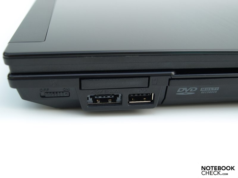 An bis zu drei USB-2.0 Anschlüsse können Peripheriegeräte angeschlossen werden. Zur schnelleren Datenübertragung an und von externen Massenspeichern wurde einer davon als USB/eSATA Kombi-Port ausgeführt.