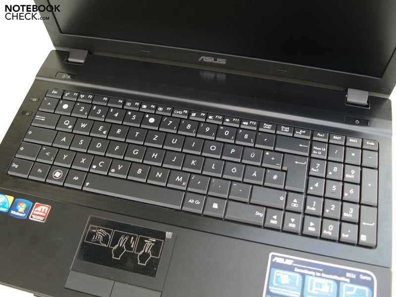 Tastatur und Touchpad eignen sich hervorragend für längeres Arbeiten mit dem Laptop. Der matte Bildschirm verhindert störende Spiegelungen und ist damit nicht nur augenschonend, sondern auch für einen Bildschirmarbeitsplatz geeignet – von einem Businessgerät sollte man sich allerdings auch nichts anderes erwarten. Beim Einsatz in sehr hellen Umgebungen, beispielsweise unter direktem Sonnenlicht würde man sich aber etwas mehr Helligkeit wünschen. Zudem gefällt die umfangreiche Sicherheits- und Kommunikationsausstattung. Mit der ATI Eyefinity Technologie sollte es problemlos möglich sein, mit mehreren Bildschirmen gleichzeitig zu arbeiten und somit mitunter den Desktop entsprechend zu vergrößern. Damit auch tatsächlich mehrer Displays angeschlossen werden können, bietet der Asus B53J gleich drei Videoschnittstellen, zwei davon digital.