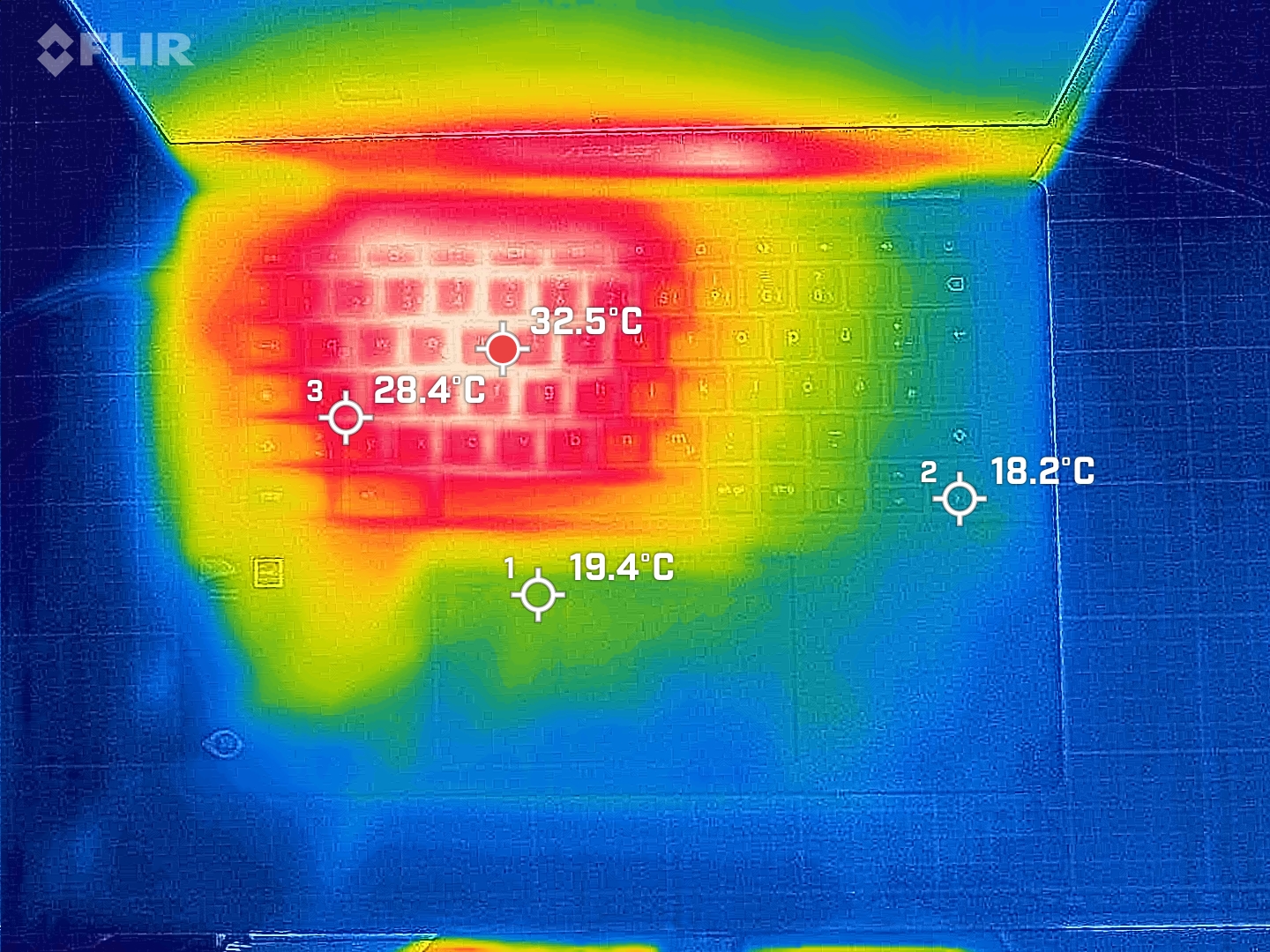 (+) Die Handballen und der Touchpad-Bereich sind mit gemessenen 22.9 °C kühler als die typische Hauttemperatur und fühlen sich dadurch kühl an.
