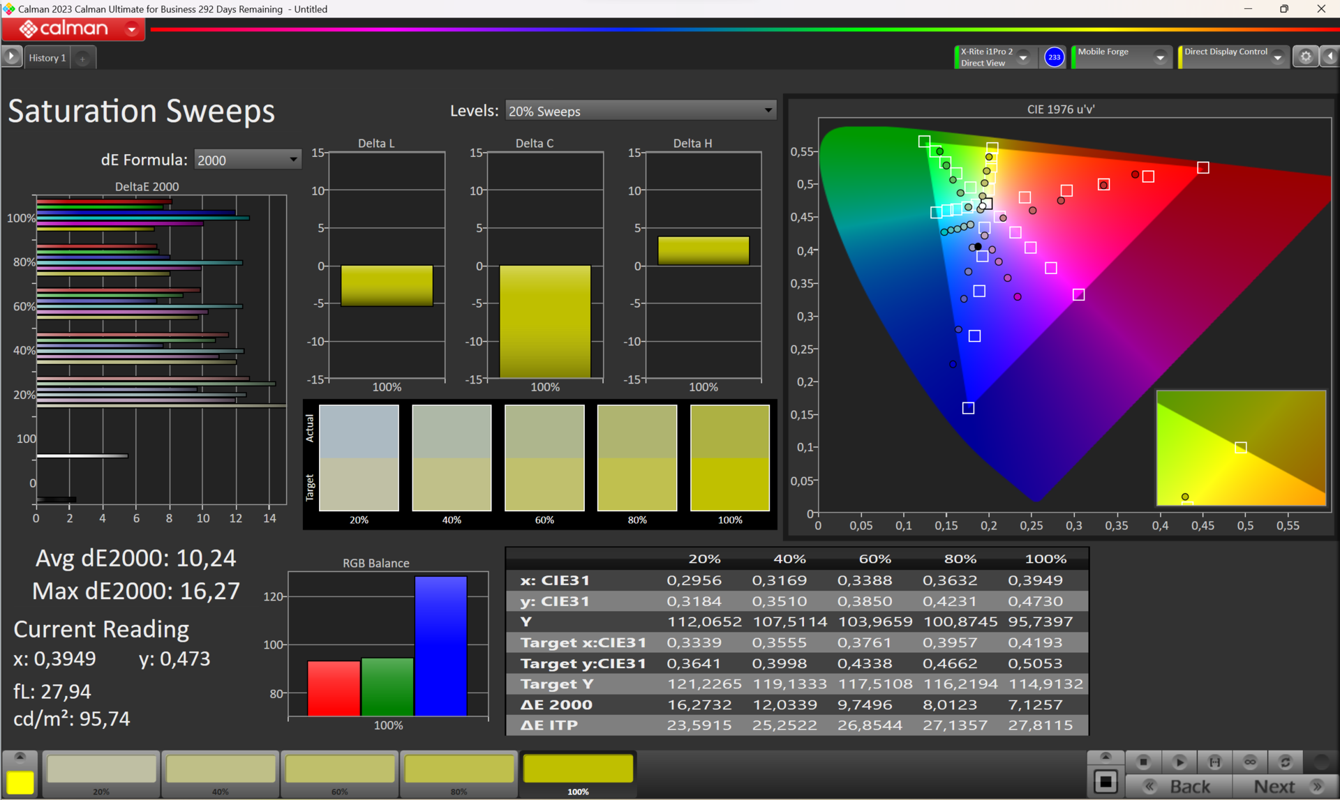 | Delta E Graustufen * | 10.3 | 2.57 75% | 14.1 -37% | 1.9 82% | 5.84 43% | 6.21 40% | 1.64 84% | 13.2 -28% |