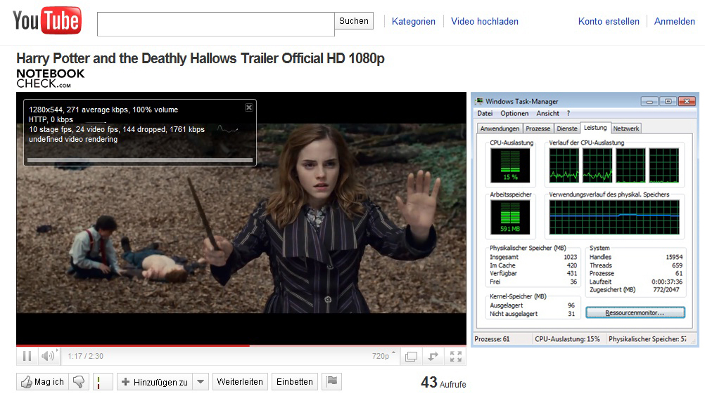 Dank starker Hardware ist der Asus Eee PC 1015PN für HD-Material prädestiniert. Mit dem Video „Big Buck Bunny“ haben wir die lokale Wiedergabe überprüft. Das H.264-HD-Video läuft in allen drei getesteten Auflösungen (480p, 720p und 1080p) durchweg flüssig, wobei die CPU-Auslastung bei maximal 20 Prozent liegt. Ähnlich verhält es sich mit Flash-HD-Videos via YouTube. Dafür haben wir uns den aktuellen Kinotrailer zu „Harry Potter and the Deathly Hallows“ angeschaut. Als SD-Video (480p) wird die Hardware kaum beansprucht (CPU-Auslastung: 12 Prozent). In 720p (1280 x 544 Pixel, 1761 kbps) und 1080p (1920 x 816 Pixel, 949 kbps) läuft der Trailer ebenfalls flüssig, wobei die Bildwiederholungsrate mit konstant 24 fps höher liegen könnte.
