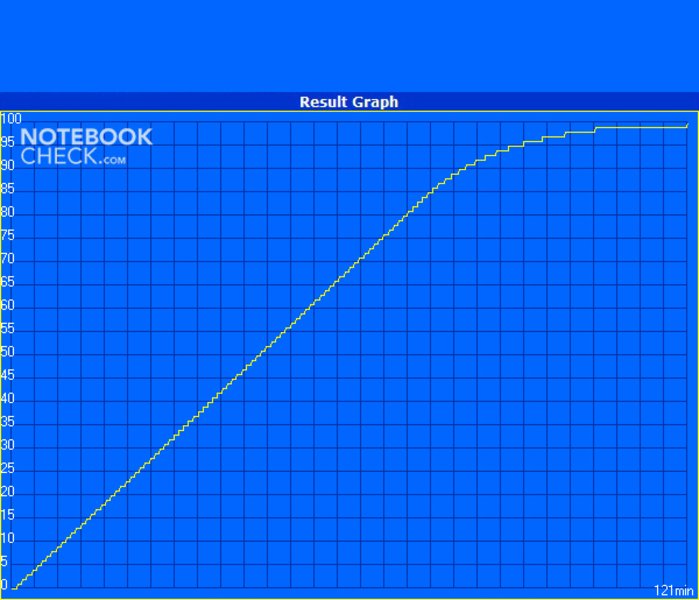 Mit einer guten Bildschirmhelligkeit und aktiviertem WLAN-Controller kann man angenehme 4 Stunden und 12 Minuten (252 Minuten) im Internet stöbern und E-Mails schreiben. Der Reader’s Test von Battery Eater simuliert das Lesen eines Textdokuments bei minimaler Bildschirmhelligkeit und deaktiviertem WLAN-Controller. Zudem sind alle Stromsparfunktionen von Asus und Microsoft aktiviert, wodurch die Laufzeit nochmals erhöht wird. Nach 5 Stunden und 40 Minuten ist auch in diesem Anwendungs-Szenario der Akku leer. Ist der Akku einmal komplett entladen dauert es knapp zwei Stunden bis er zu 100 Prozent wieder aufgeladen ist.