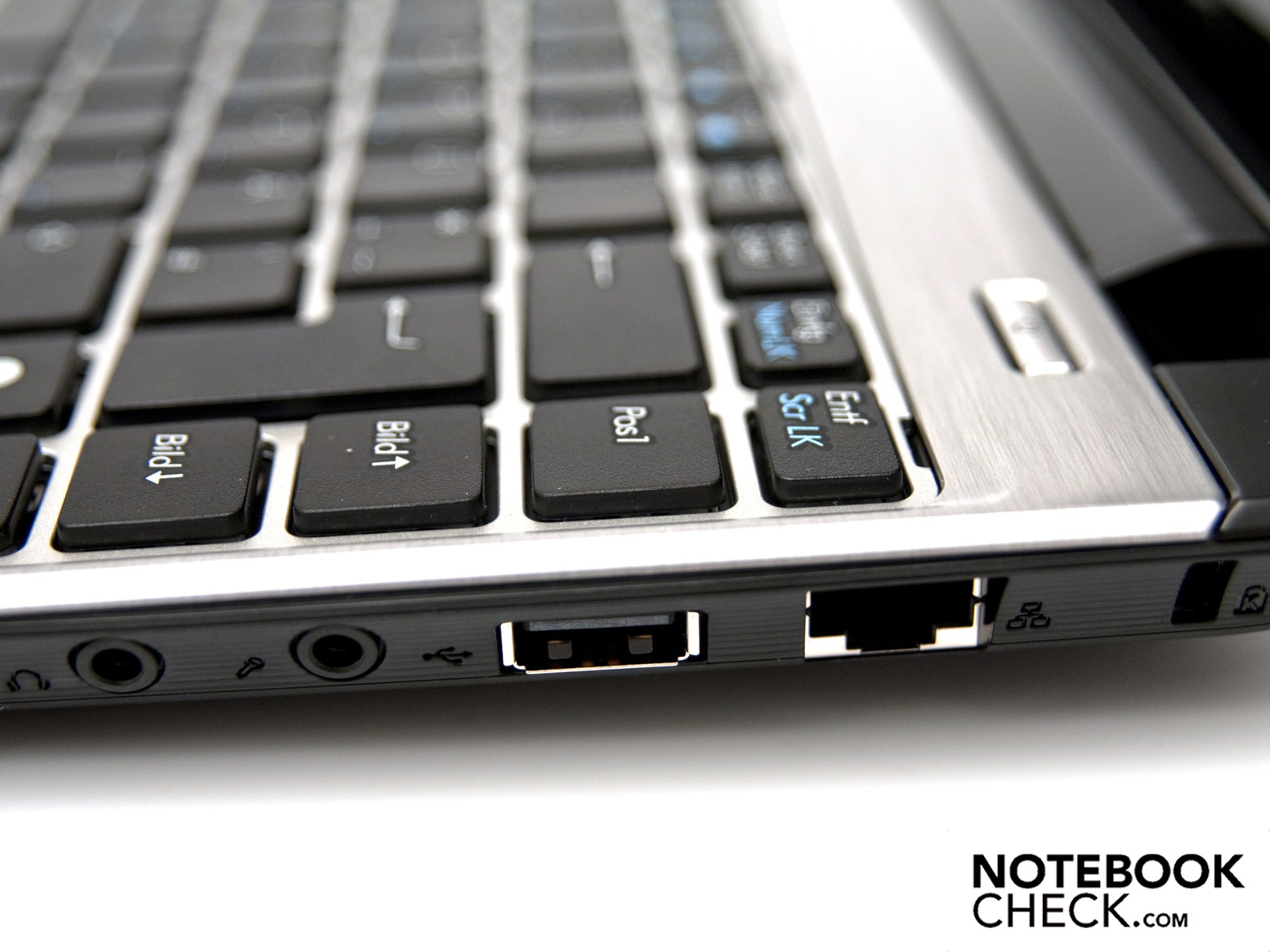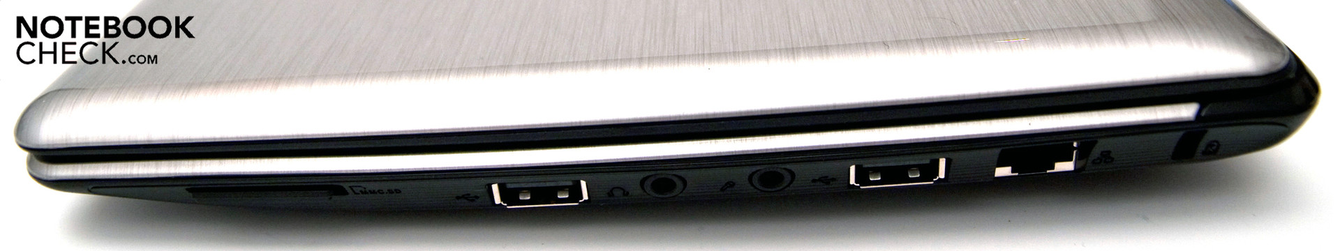 Gegenüber an der rechten Seite finden sich zwei weitere USB-2.0-Schnittstellen, die glücklicherweise durch die Audioanschlüsse (Kopfhörerausgang, Mikrofoneingang) voneinander getrennt sind. So kommt es nicht zu Platzproblemen. Zudem finden sich hier ein 2-in-1-Kartenleser, der SD- (SDHC) und MMC-Speichermedien verarbeiten kann, ein RJ-45-Netzwerkanschluss und ein Kensington Lock.
