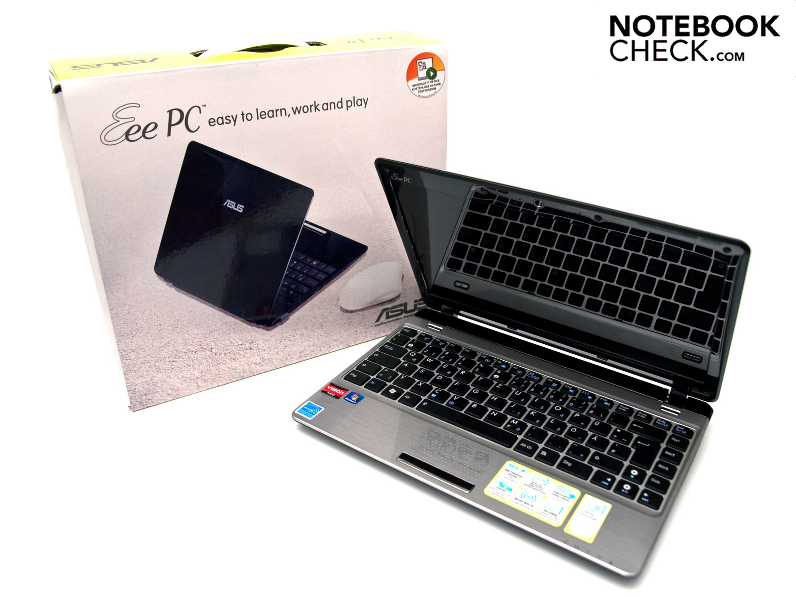 Das Design ist zeitgemäß und die integrierte Chiclet-Tastatur in Schwarz wertet den Eee PC optisch auf. Ein weiterer Vorteil der Tastatur ist das ergonomische Design, wodurch man angenehmer und ohne Ermüdungserscheinungen tippen kann. Unser silbernes Testgerät verfügt über ein Gehäusemuster, das die Oberfläche von gebürstetem Aluminium erfolgreich imitiert. Nicht zuletzt durch dieses Muster wirkt das Gesamtdesign sehr hochwertig.