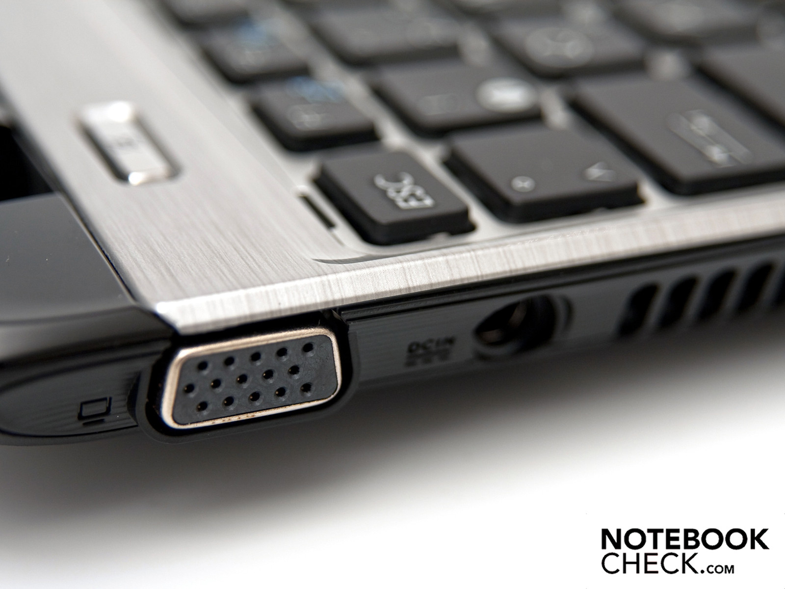 An der linken Seite des Gerätes finden sich ein USB-2.0-Port, der Stromanschluss und ein analoger Videoausgang (VGA) über den sich ein externer Monitor oder Fernseher anschließen lässt. Die maximale Ausgabe liegt bei 1920 x 1080 Pixel (Full HD), wobei die Bildqualität nicht mit einem HDMI-Ausgang mithalten kann. Durch den großen Luftauslass finden sich an der linken Seite keine weiteren Anschlussmöglichkeiten.