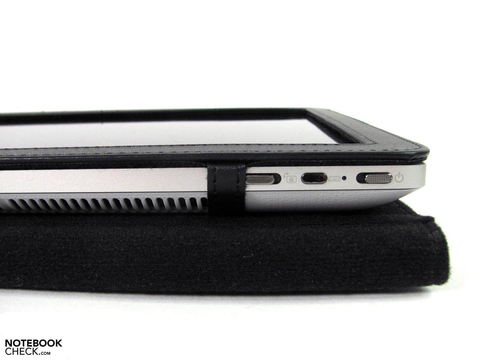 Nicht nur für Unterwegs hat Asus eine unauffällige Schutzhülle aus schwarzem Kunstleder und Fleece mit in den Lieferumfang gepackt. Diese bewahrt den Slate vor äußeren Einflüssen und bietet zusätzlich eine Aufstellmöglichkeit. Das Material ist zwar nicht mit echtem Leder vergleichbar, es sieht aber ordentlich aus und macht einen widerstandsfähigen Eindruck. Asus hat sich sichtlich Mühe gegeben, alle Bedienelemente auch mit angelegter Hülle erreichbar zu halten. Bis auf die Ausrichtungssperre für den Bildschirm ist das auch gelungen, diese wird bei unserem Testsample zum Teil verdeckt.