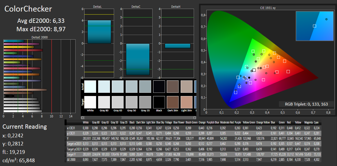 | Delta E Colorchecker * | 6.33 | 10.77 -70% | 12.53 -98% | 9.3 -47% | 11.14 -76% |