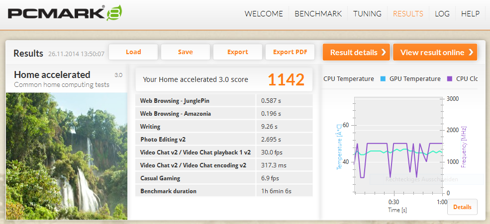 | PCMark 8 Home Score Accelerated v2 | 1142 Punkte | |