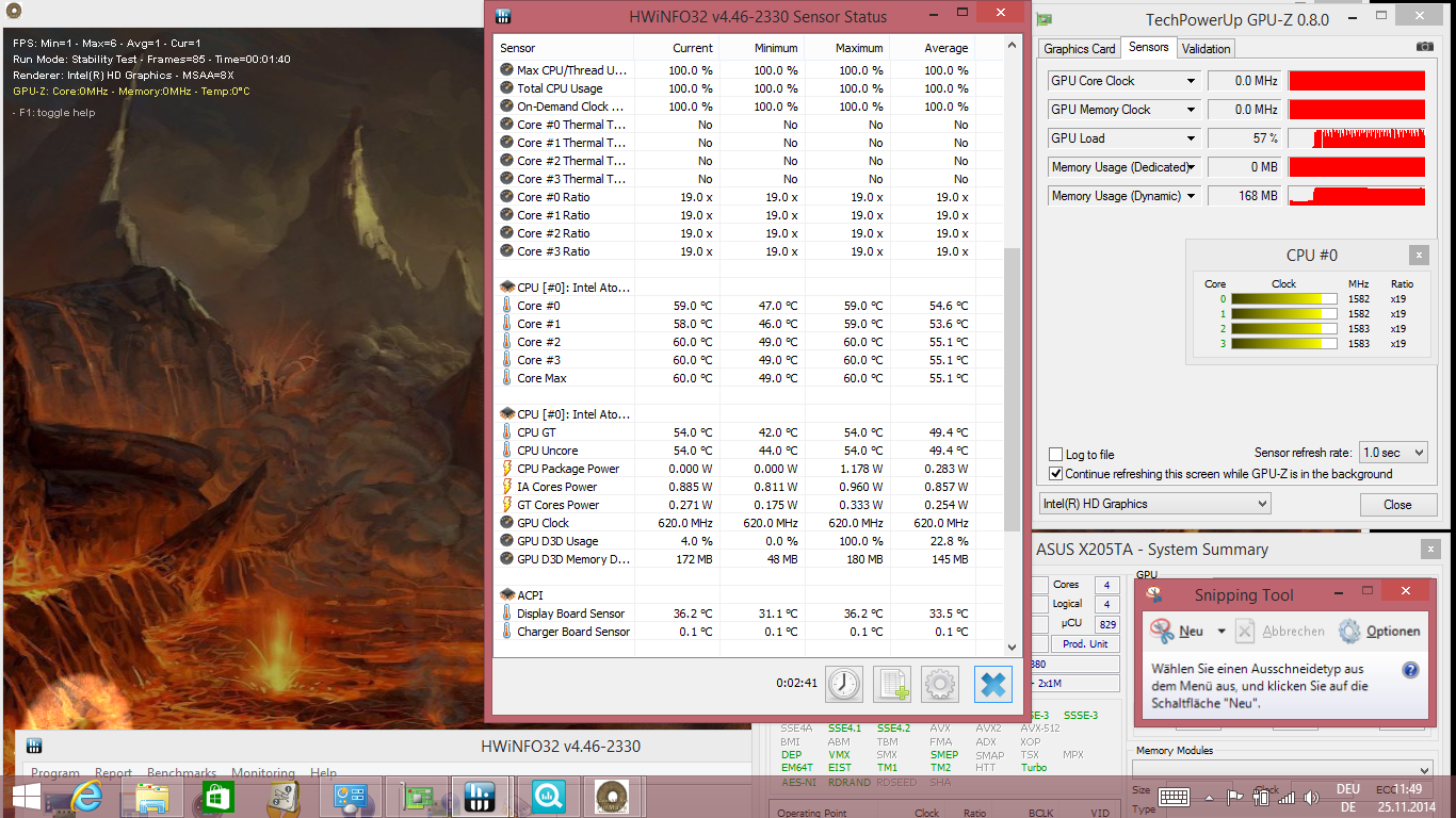 Performance Geeks im Netbook-Revier kommen also nicht auf ihre Kosten, zumal Asus den Turbo bei 1,6 GHz gekappt hat. Mehr als 1,6 GHz war in keinem Benchmark drin (Single & Multi). Die Taktung konnte das X205 dann aber konstant halten (auch bei Multi-Core-Stress).