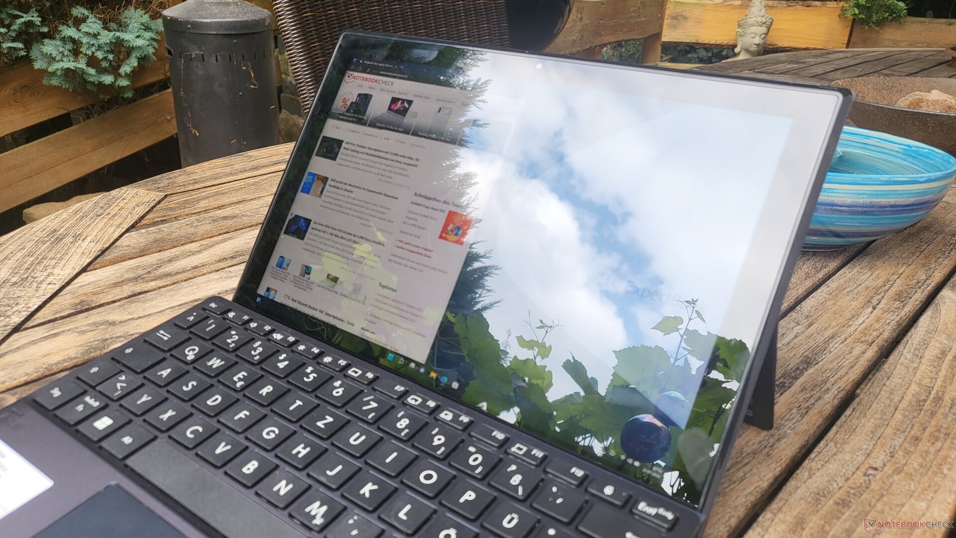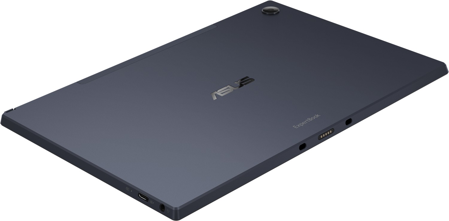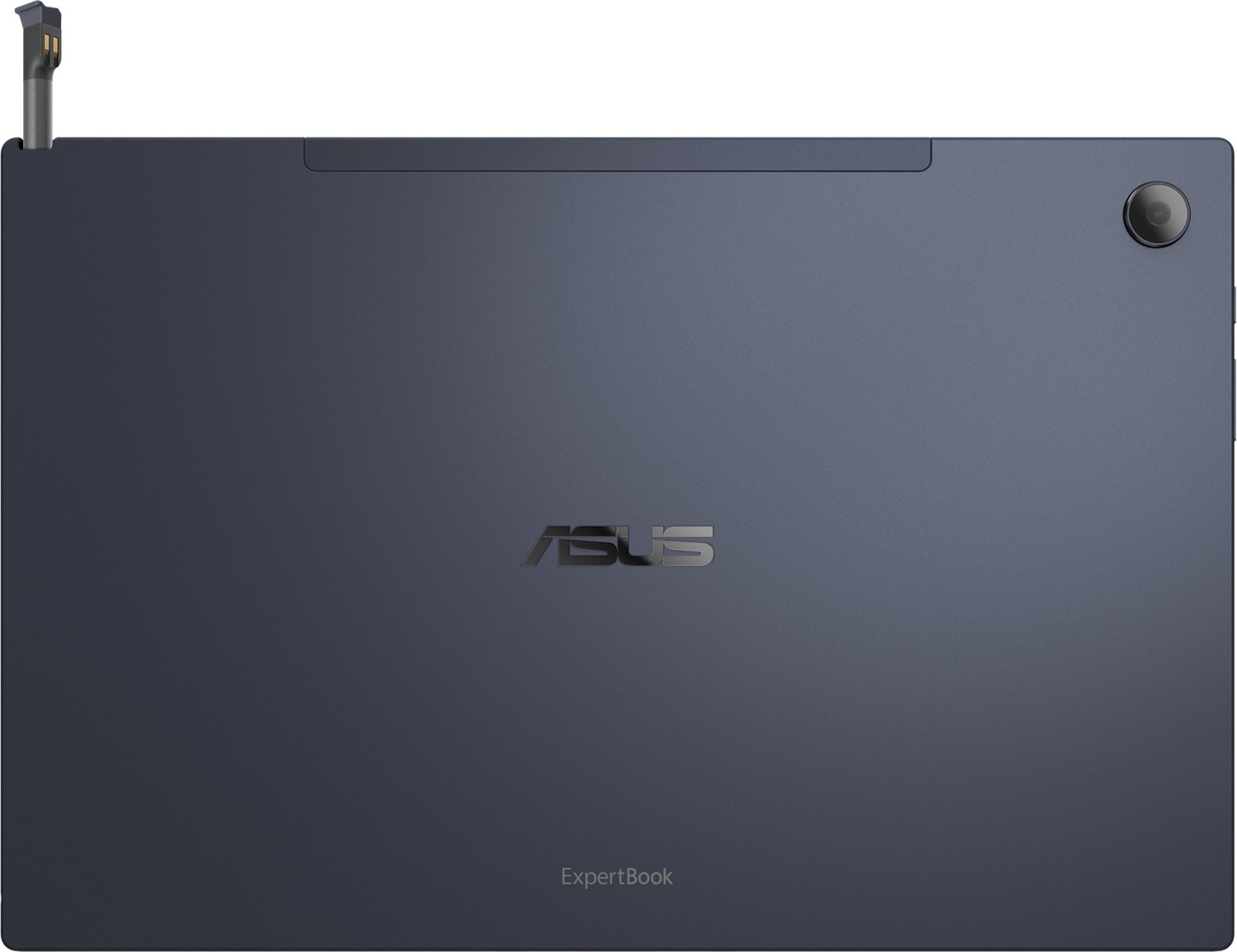 Im angeschalteten Zustand begrüßen den Nutzenden die breiten Displayränder. Den Trend zu dünnen Rahmen und größeren Displays geht Asus nicht mit. Dafür ist das ExpertBook allerdings auch relativ kompakt und das reine Tablet, ohne Zubehör, ist auch ziemlich dünn. Sein Gehäuse besteht aus Aluminium, dem Display ist eine Glasscheibe vorgesetzt. Aus Kunststoff ist der Verbindungsstreifen zwischen Display und Rückseite hergestellt, zudem besteht ein kleiner Teil der Rückseite aus Plastik. Verarbeitung und Stabilität des Tablets sind gut, wenn auch nicht perfekt.