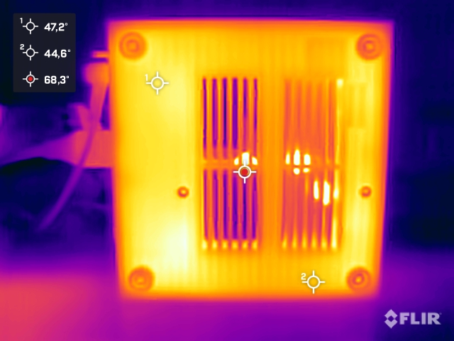 (-) Auf der Unterseite messen wir eine maximalen Wert von 47.2 °C (im Vergleich zum Durchschnitt von 36.4 °C).