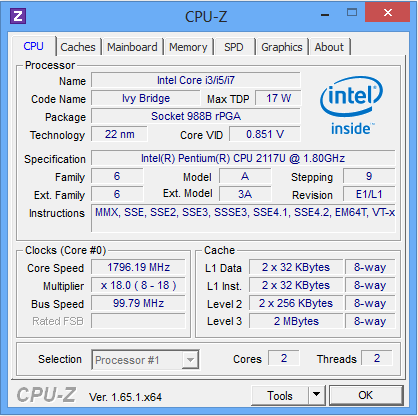 Im F550CA verrichtet ein Pentium 2117U-Prozessor seinen Dienst. Dieser Ivy-Bridge-Zweikernprozessor arbeitet mit einer Geschwindigkeit von 1,8 GHz. Einen Turbo gibt es nicht. Der Pentium gehört der Klasse der ULV-Prozessoren an. Das Kennzeichen dieser CPUs ist ihr verhältnismäßig geringer Energieverbrauch. Intel nennt für den Pentium eine TDP von 17 Watt.