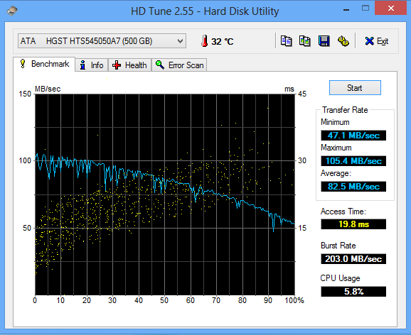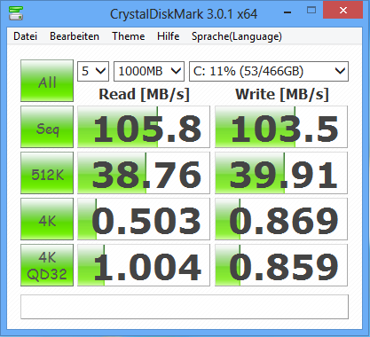 Asus verbaut im F550CA eine Festplatte von HGST. Sie besitzt eine Kapazität von 500 GB und arbeitet mit 5.400 Umdrehungen pro Minute. CrystalDiskMark meldet eine Lesegeschwindigkeit von 105,8 MB/s. HD Tune liefert eine durchschnittliche Transferrate von 82,5 MB/s. Das sind gute Werte für eine 5.400er-Festplatte.