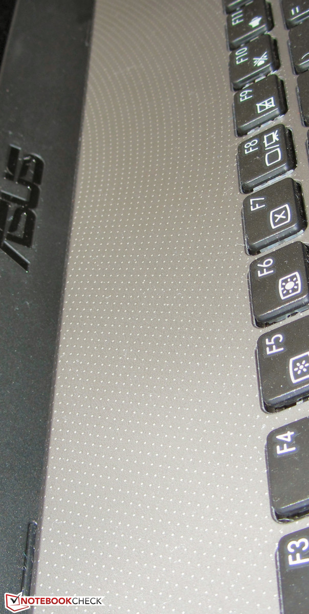 Das Preisniveau des F550CA verrät, dass der Käufer hier keine Aluminiumelemente erwarten kann. Das gesamte Gehäuse besteht aus Kunststoff. Das hat das Asus-Notebook mit dem G500s und dem Satellite gemeinsam. Der Verzicht auf spiegelnde Oberflächen beim F550CA fällt sofort positiv auf. Asus setzt zwei Farben ein: Die Oberseite der Baseunit strahlt in einem Silbergrau, die Unterschale sowie die Deckelrückseite sind in Schwarz gehalten. Die Handballenablage und die Deckelrückseite sind zusätzlich mit einer Textur versehen. Auf der Rückseite kommen Rillen zum Einsatz, die sich kreisförmig um den Mittelpunkt herum ausbreiten. Die Handballenablage ist mit einem sehr feinen Gitter versehen.