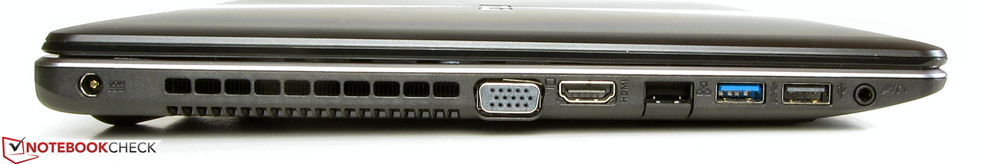 Alle drei Vergleichsrechner können mit den heutzutage üblichen Schnittstellen aufwarten. Das F550CA bietet als einziges Gerät einen Gigabit-Ethernet-Steckplatz. Das Satellite und das G500s offerieren nur Fast-Ethernet. Gut: Jedes Notebook ist mit mindestens einem USB-3.0-Anschluss ausgestattet. Die Schnittstellenanordnung des F550CA ist nur teilweise akzeptabel. Alle Schnittstellen der linken Seite befinden sich auf Höhe der Handballenablage und könnten damit für Linkshänder bei der Benutzung einer Maus stören, dafür ist die rechte Seite aber frei von Steckplätzen.