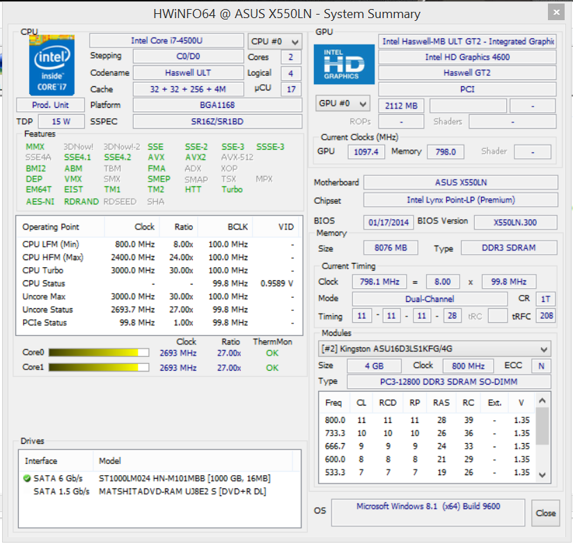 Das F550LN ist mit einem Core i7-4500U Zweikernprozessor bestückt. Dieser basiert auf Intels aktueller Haswell Architektur und arbeitet mit einer Basisgeschwindigkeit von 1,8 GHz. Per Turbo kann die Geschwindigkeit auf 2,7 GHz (beide Kerne) bzw. 3 GHz (nur ein Kern) erhöht werden. Der Prozessor gehört zu den sparsamen Vertretern seiner Art. Die TDP beträgt 15 Watt.