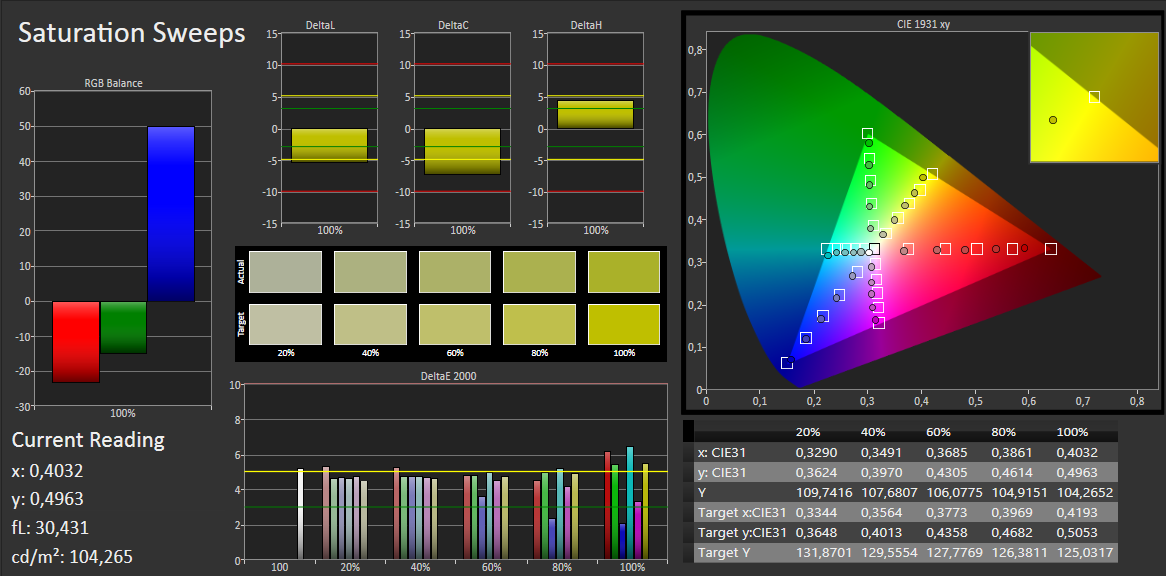 Von Notebooks der Firma Asus sind wir gute Farbwerte gewohnt. Das ist nicht auf den Einsatz hochwertiger Displays zurückzuführen, sondern auf die Tatsache, dass Asus Farbprofile vorinstalliert. So ist es auch beim F551MA der Fall. Die durchschnittliche DeltaE-2000-Abweichung liegt bei einem Wert von 4,7. Damit ist es nicht allzu weit vom Zielbereich (DeltaE kleiner 3) entfernt. Einen Blaustich weist der Bildschirm nicht auf.