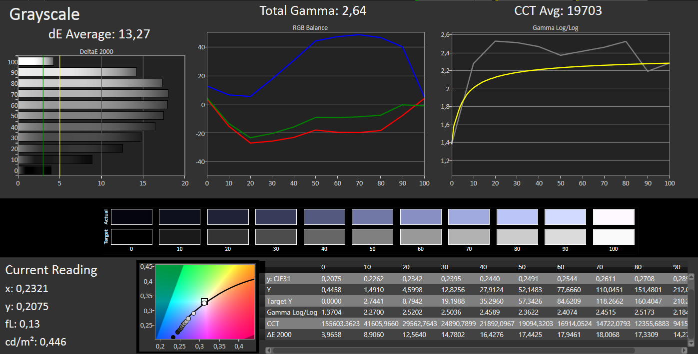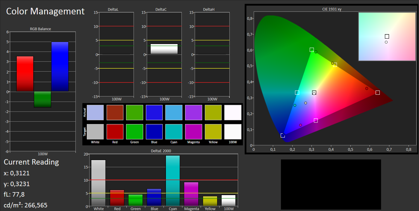 Im Auslieferungszustand haben wir den Bildschirm vermessen (Zielfarbraum sRGB) und konnten dabei erhebliche DeltaE-2000-Abweichungen bei Weiss, Cyan und den Graustufen feststellen. Die übrigen Farben befinden sich allerdings auch nicht im Zielbereich (DeltaE kleiner 5). Das Display leidet unter einem deutlichen und sichtbaren Blaustich.
